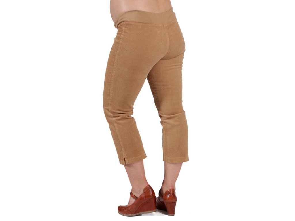 3/4 tehotenské menčestrové nohavice s úzkymi nohavicami. Predný diel s falošným zapínaním, zadný diel hladký. Vhodné k čižmám alebo dajú vyniknúť pekným pančuchám. V páse je všitý úplet s možnosťou regulácie obvodu pásu.