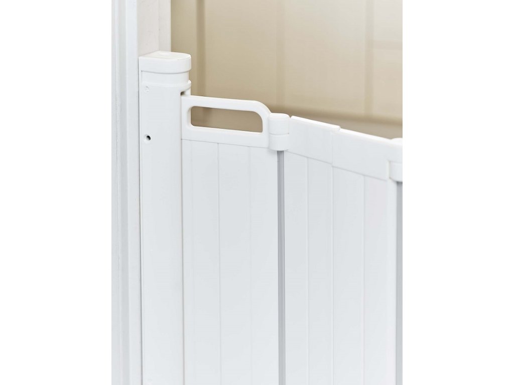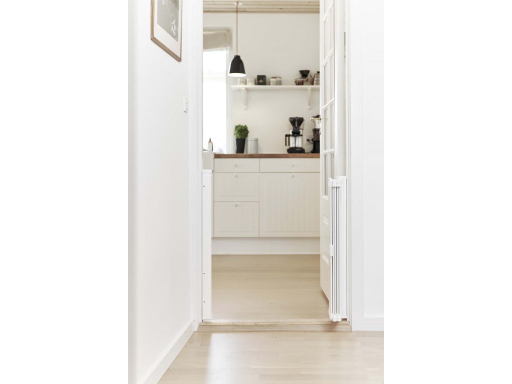 S bezpečnostnou zábranou BabyDan ALMA nebudú úzke priestory vo vašej domácnosti prekážkou pre udržanie bezpečia vášho dieťaťa. Jedná sa o zaťahovaciu bezpečnostnú zábranu, ktorá sa automaticky skladá, takže takmer nezaberá žiadne miesto. Môžete ju otvoriť iba jednou rukou, aby ste ju mohli prejsť aj keď máte plné ruky. Je vhodná takmer pre akýkoľvek otvor, pretože sa môže namontovať na vnútornú aj vonkajšiu stranu rámu dverí alebo aj medzi steny. Pokiaľ namontujete zábranu do rámu dverí, zmestí sa do otvoru 64,5 – 89 cm. Pokiaľ ju namontuje mimo rámu dverí, zmestí sa do otvoru 55 – 79,5 cm. Môžete si zakúpiť ďalšie predĺženie až do 113,5 cm veľkosti otvoru.