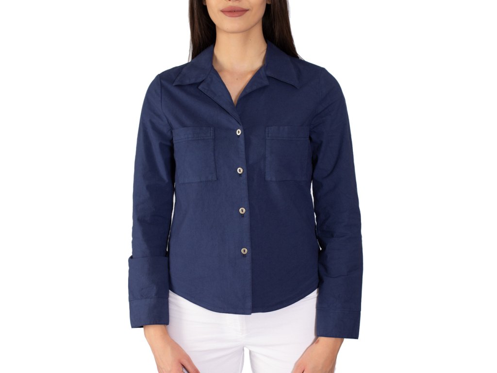 Veľmi príjemná a pohodlná polopriliehavá bavlnená košeľa tmavo modrej farby s nakladanými vreckami na prsiach, rozhalenkou a dlhými rukávmi ukončenými širšou dotykovou manžetou. Predný diel je členený bočnými prsnými záševkami, na zadnom diele odšité pasové záševky. V spodnej časti rukáva je do manžety zložený malý záhyb. Zapínanie na kovové gombíky striebornej farby.
