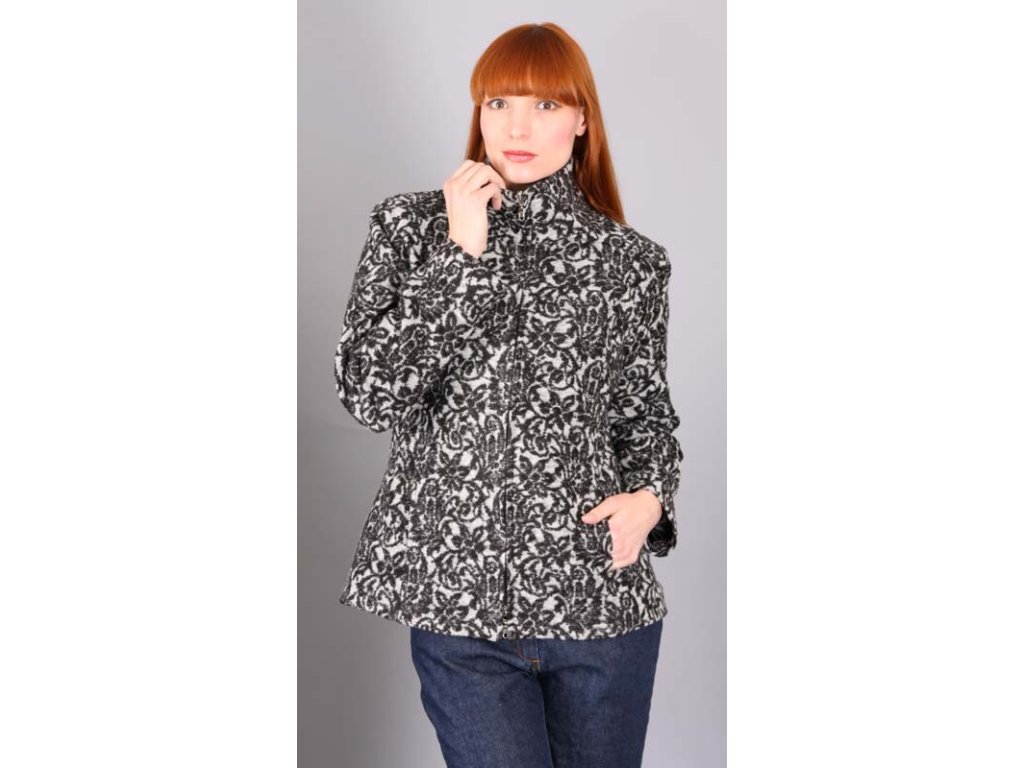 Dámska bunda s krásnym kvetinovým vzorom. Zapínanie na zips po celej dĺžke aj cez stojačik pri krku. Vrecká sú všité do zvislých švov tvarujúcich postavu. Zadný diel bundy je zateplený vatelínom, ktorý výborne hreje chrbát.