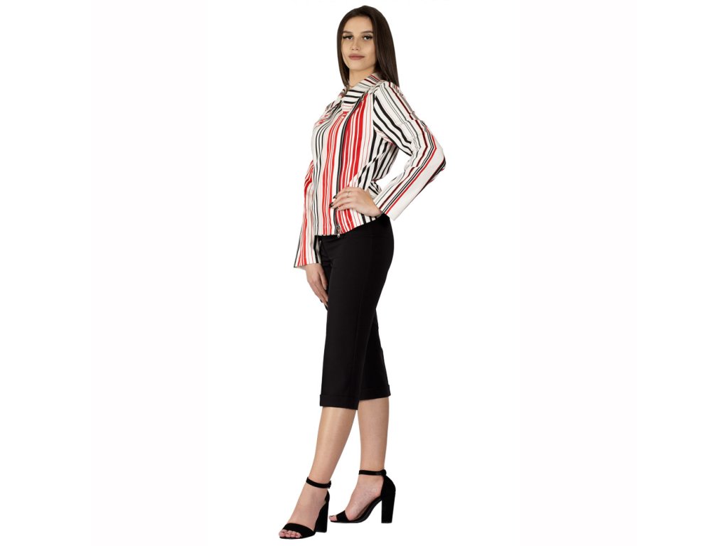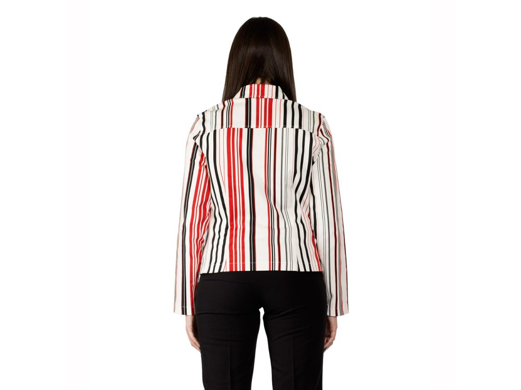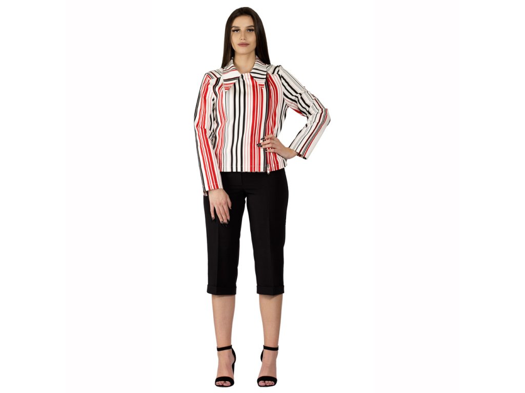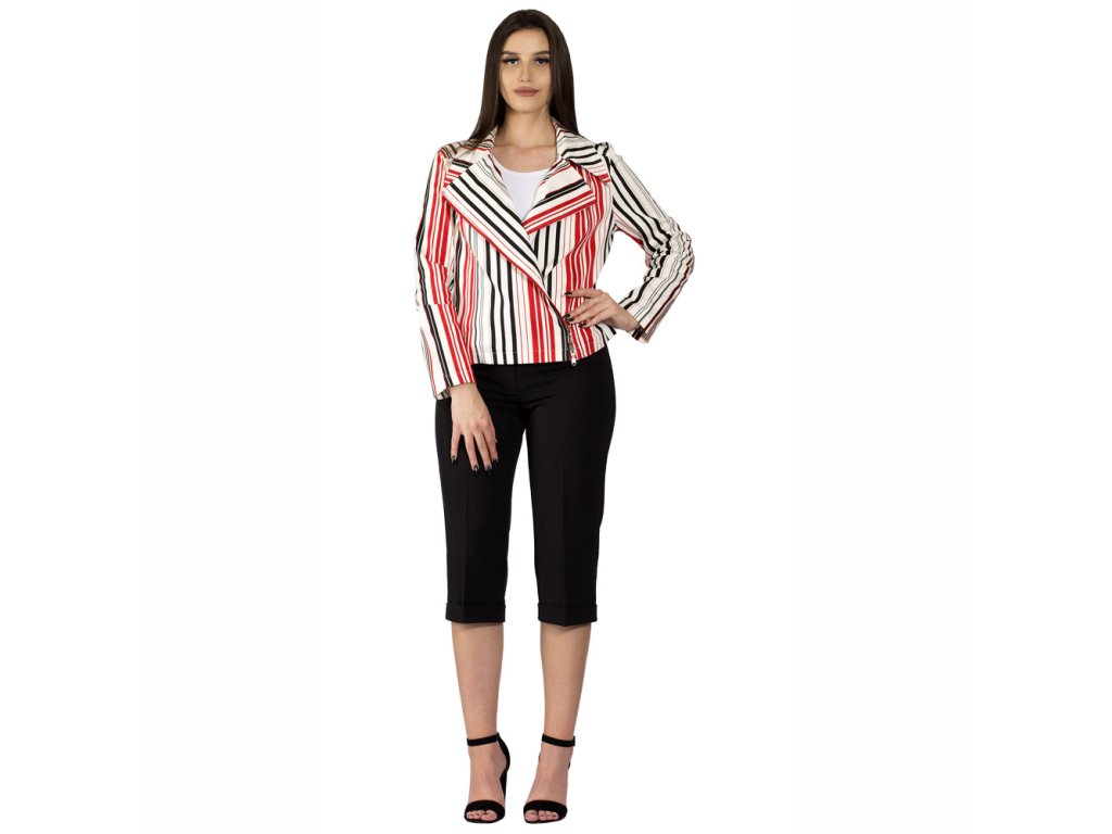 Dámska ľahká a štýlová bavlnená bundička s výrazným špicatým golierom a zapínaním na zips pripomína svojim vhľadom motorkársku bundu. Predný diel je členený krátkym sedlom, z ktorého vedú činniace švy. Do ľavého je umiestnený ozdobný dvojcestný zips. Zadný diel je tiež členený sedlom a pasovými záševkami. Rukáv je jednošvový. Je vyrobená z pevnejšieho bavlneného materiálu s prímesou lycry. Je bielej farby s čiernymi a červenými prúžkami a nie je vypodšívkovaná.