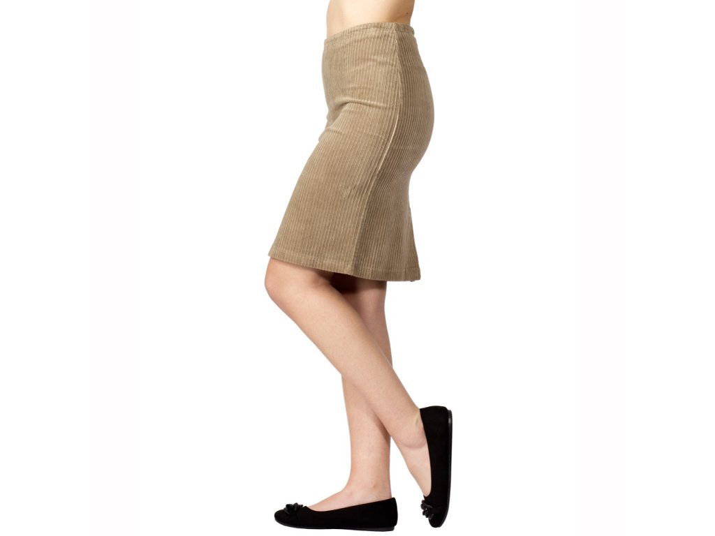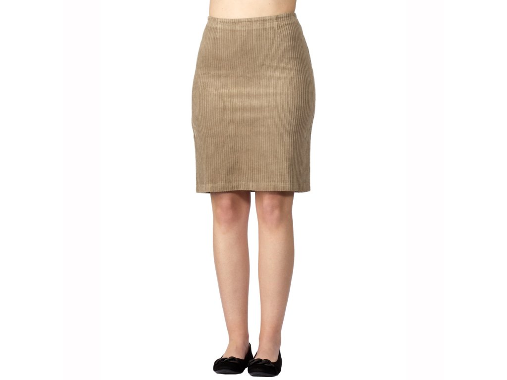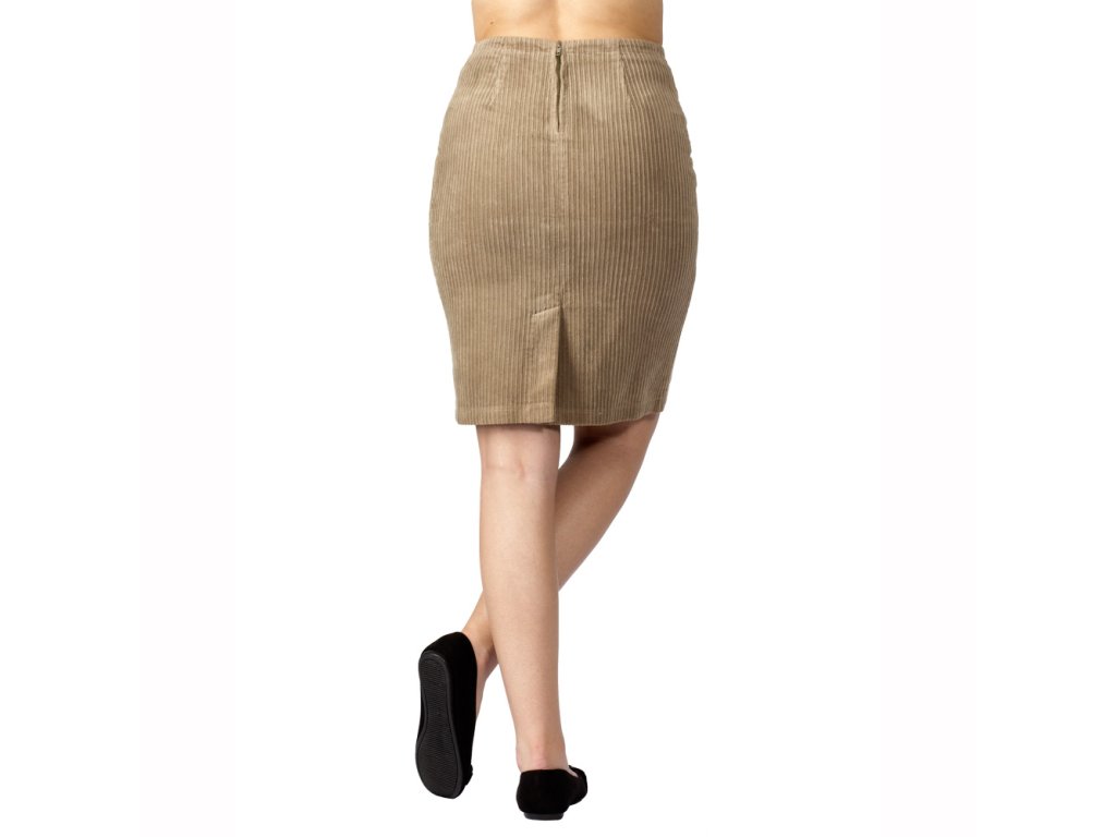 Dámska puzdrová sukňa je vyrobená z hebkého menčestra farby capuccina s hrubším rebrovaním. Pás je zapravený širšou tvarovanou podsádkou. Na prednom aj zadnom diele sú odšité pasové záševky. Zadný diel je ďalej členený stredovým švom, do ktorého je všitý zips av spodnej časti nákrytový rozparok.