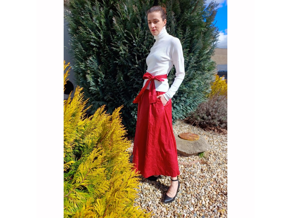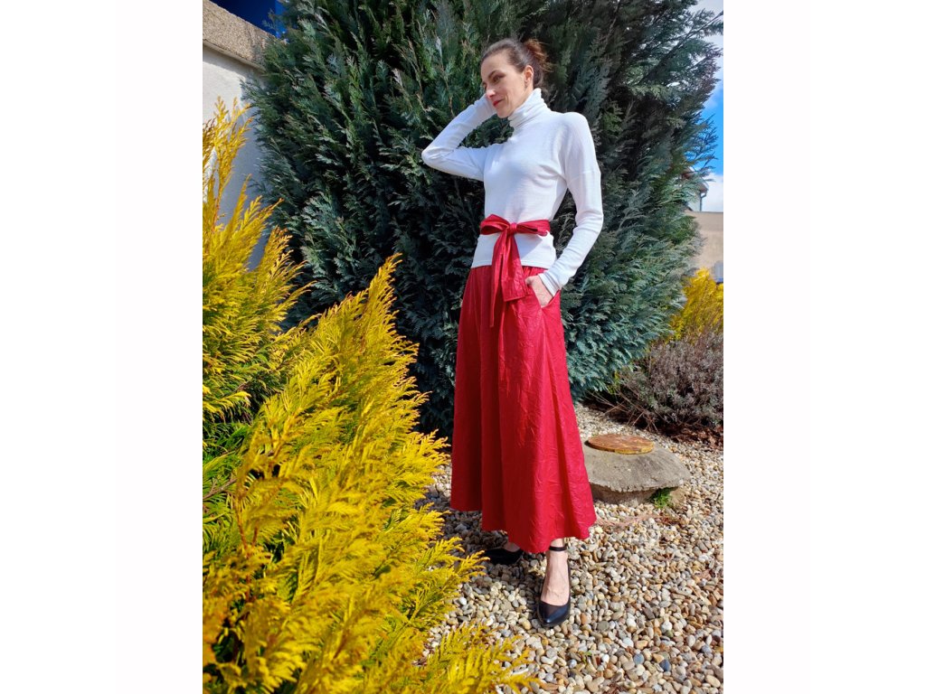 Dámska štvrťkolová sukňa je vyrobená z imitácie krčenej kože červenej farby. Pás je zapravený tunelíkom s gumou. V bočných švoch sú umiestnené pohodlné vrecká.