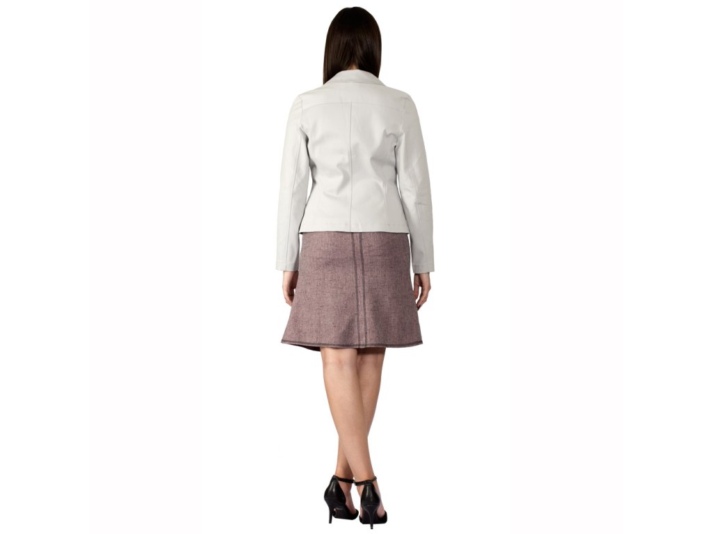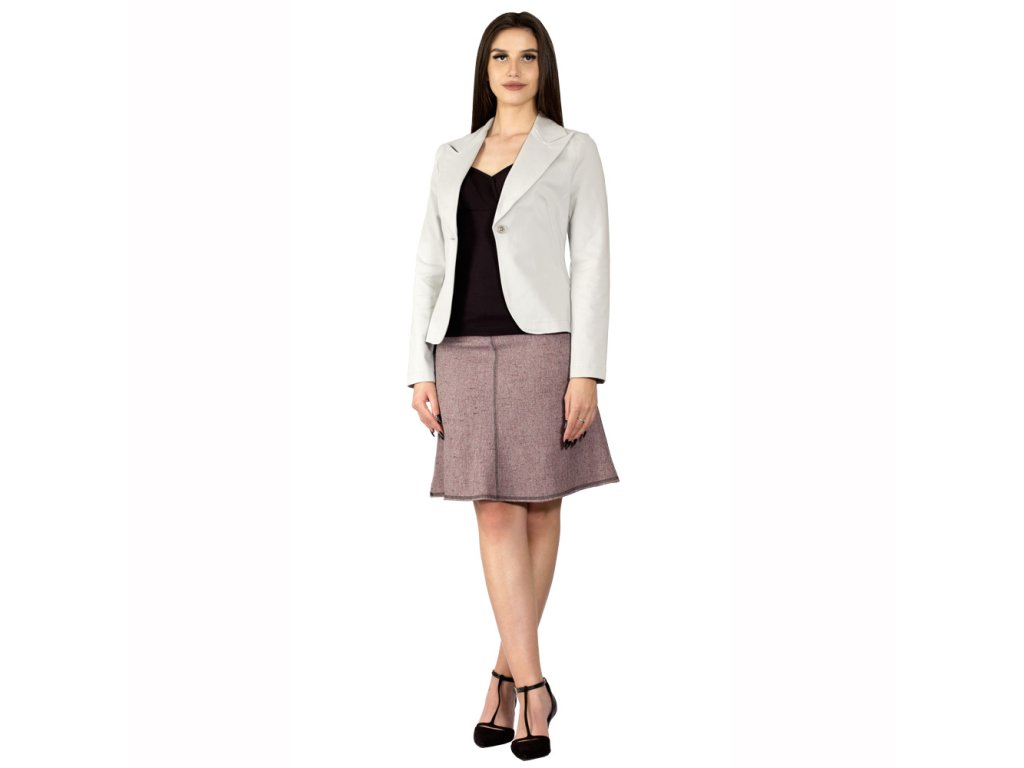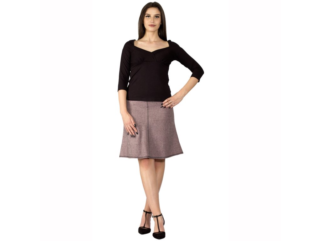 Dámska štvordielna sukňa zvončekového tvaru v dĺžke ku kolenám. Predný aj zadný stredový šev a dolný kraj sukne sú ozdobne prešité kontrastnou niťou. Na zadných dieloch odšité pásové záševky a do stredového švu je všitý skrytý zips. Horný kraj sukne je zapravený podšívkou, ktorou je sukňa vypodšitá. Je vyrobená z polyesterového splývavého materiálu, nekrčí sa a je nenáročný na údržbu.