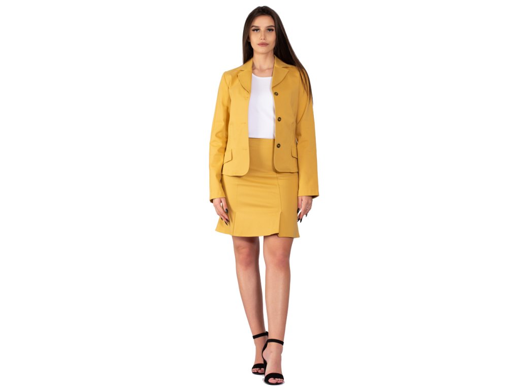 Ľahké dámske nepodšité sako s fazónou, zapínané na tri gombíky. Na prednom diele sú odšité pásové záševky a našité ozdobné pätky. Zadný diel je členený sedlom, stredovým a bočnými členiacimi švami. Rukáv je jednošvový a sredom je ozdobne prešitý. Vyrobené z bavlneného materiálu horčicovo žltej farby s prímesou lycry. Vhodné na kombináciu so sukňou Domizia. Môžete nosiť ale aj k rifliam. Sako horcicovej farby vám dodá ten správny "šmrnc" a rozžiari váš šatník.