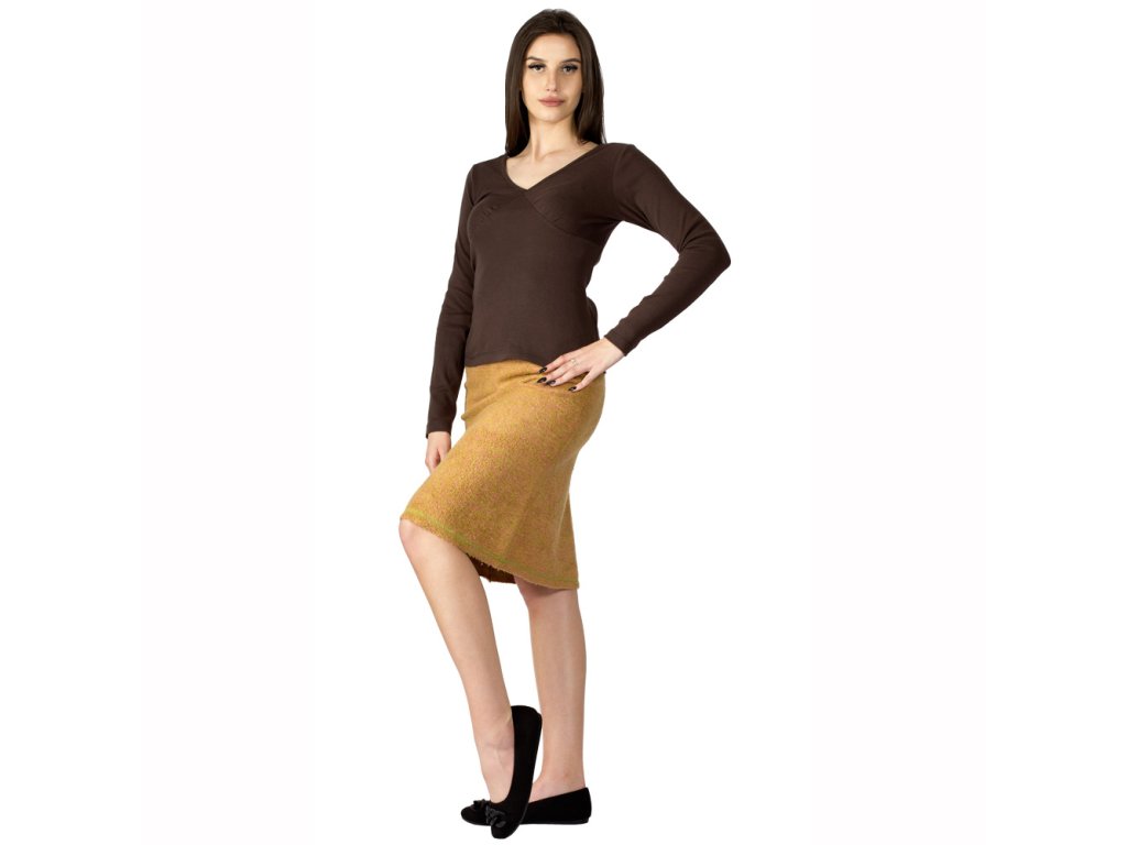 Elegantné dámske tričko z hrejivého bavlneného úpletu tmavo hnedej farby s výstrihom do V, zaujímavo riešeným predným dielom a dlhými rukávmi.