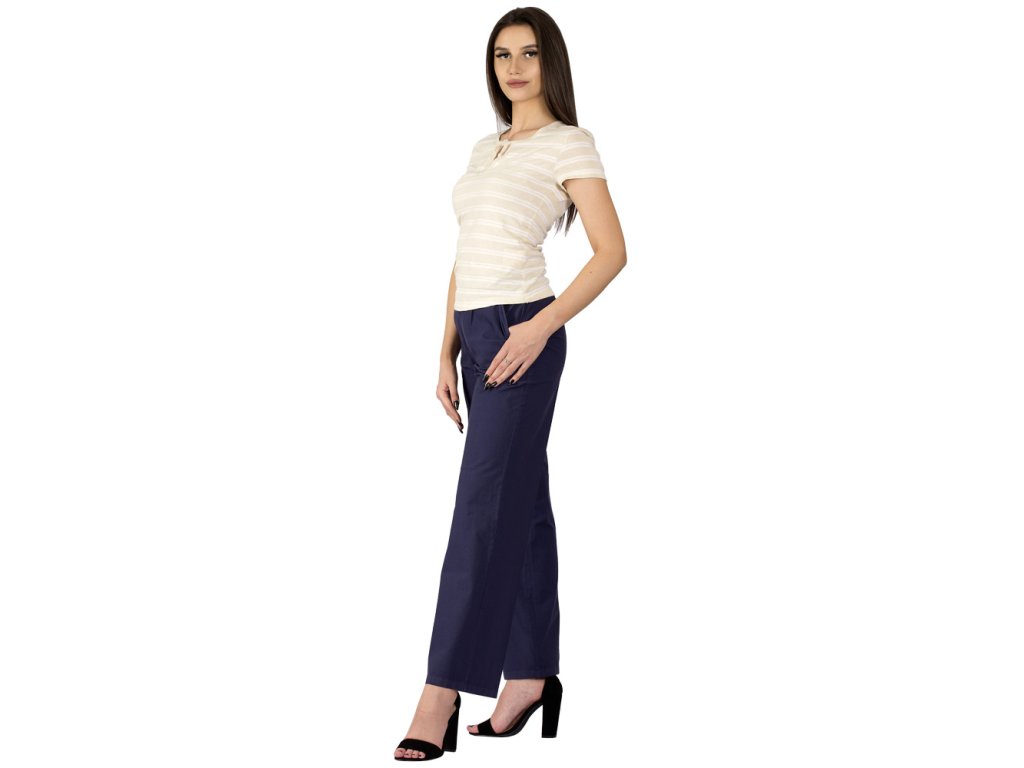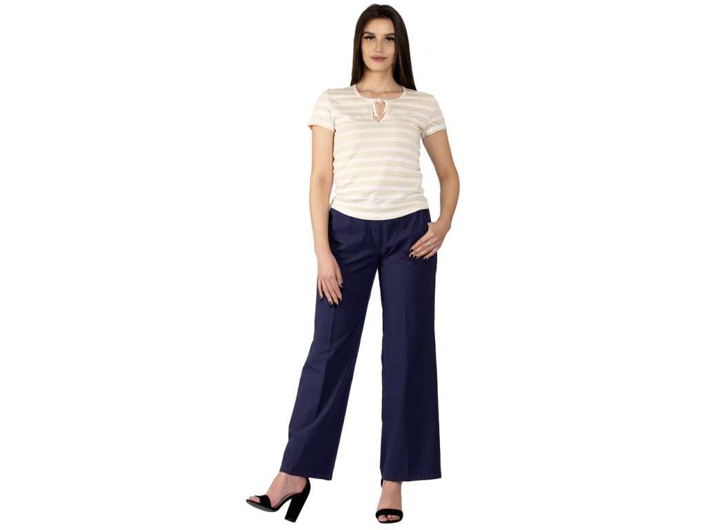 Dámske letné polopriliehavé tričko z jemného bavlneného úpletu svetlo hnedej farby s jemným bielym a zlatým prúžkom. Má stredne hlboký okrúhly výstrih s prestrihom, viazačkami a krátkymi rukávmi. Hodí sa skvele k nohaviciam aj k sukni.