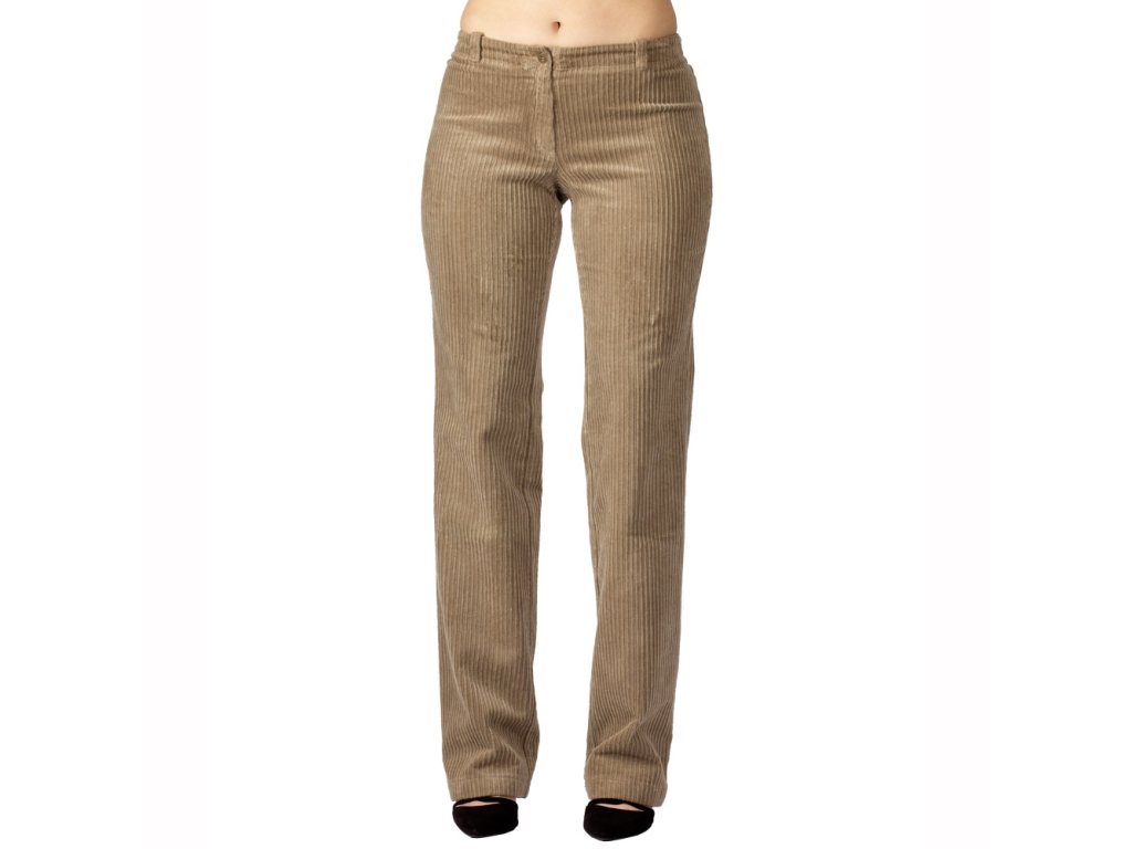 Dámske menčestrové nohavice béžovej farby s rovnými nohavicami. Dolný obvod nohavíc pri veľkosti 36 je 46 cm. Predný diel je bez členenia, zadný diel je členený sedlom a sú tu našité vrecká. Oblasť pása je zapravená tvarovanou podsádkou a je doplnená pútkami. Menčester s hrubším žebrovaním.