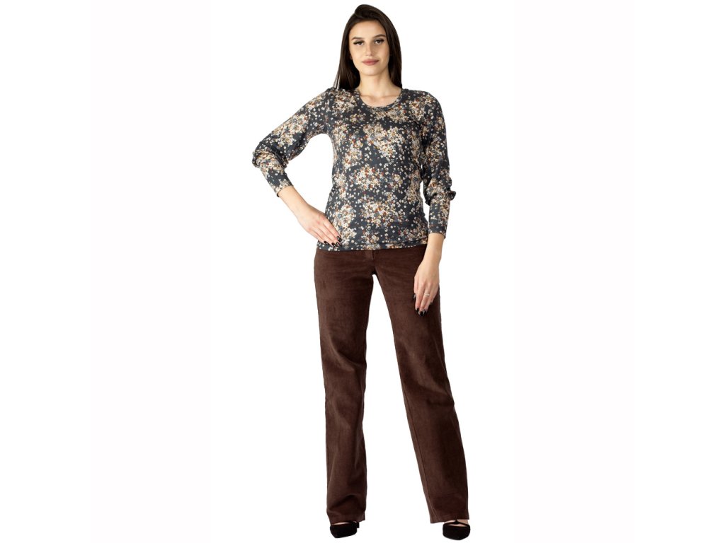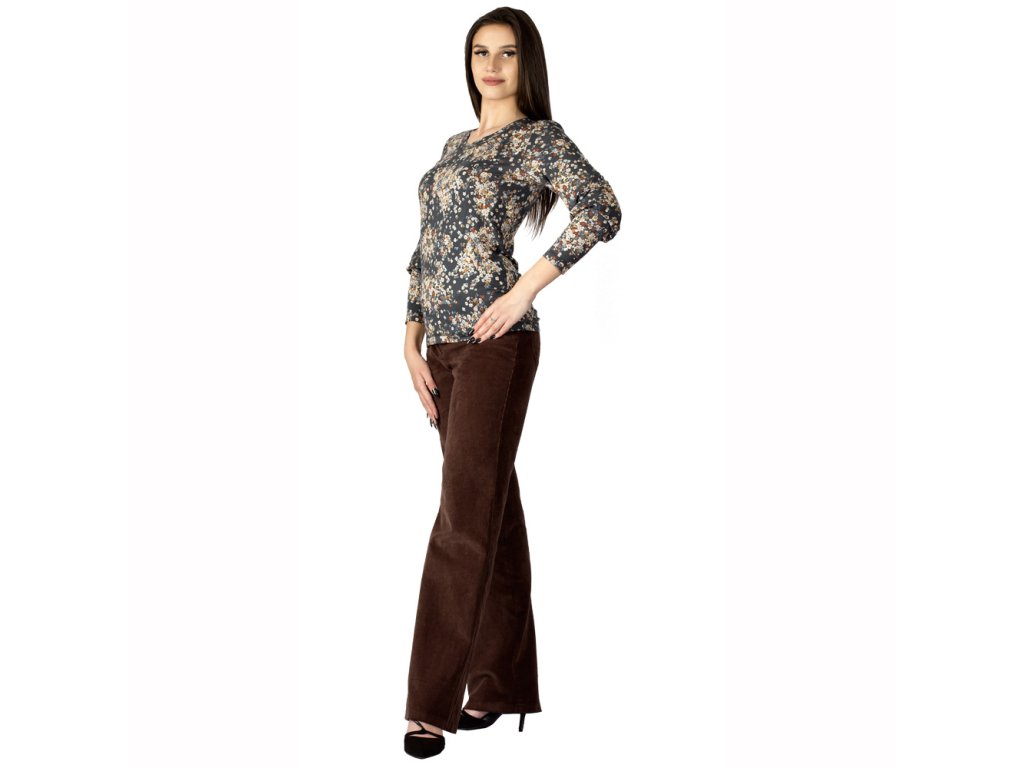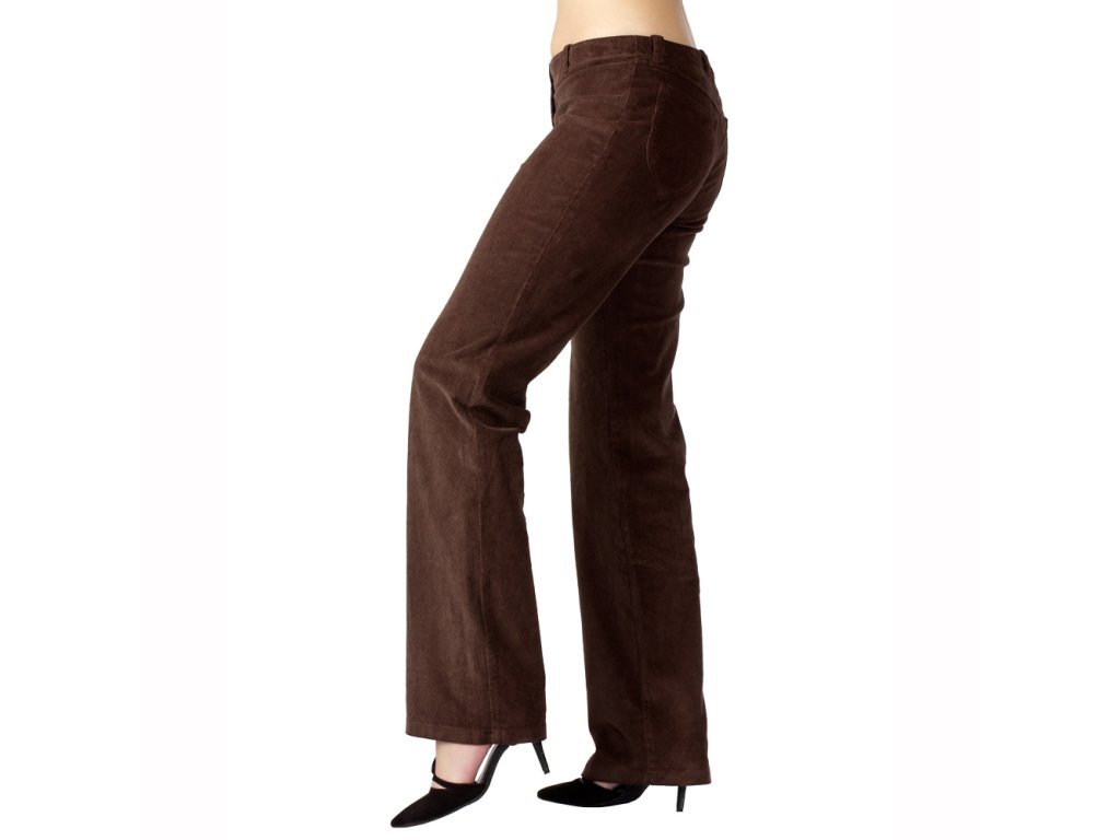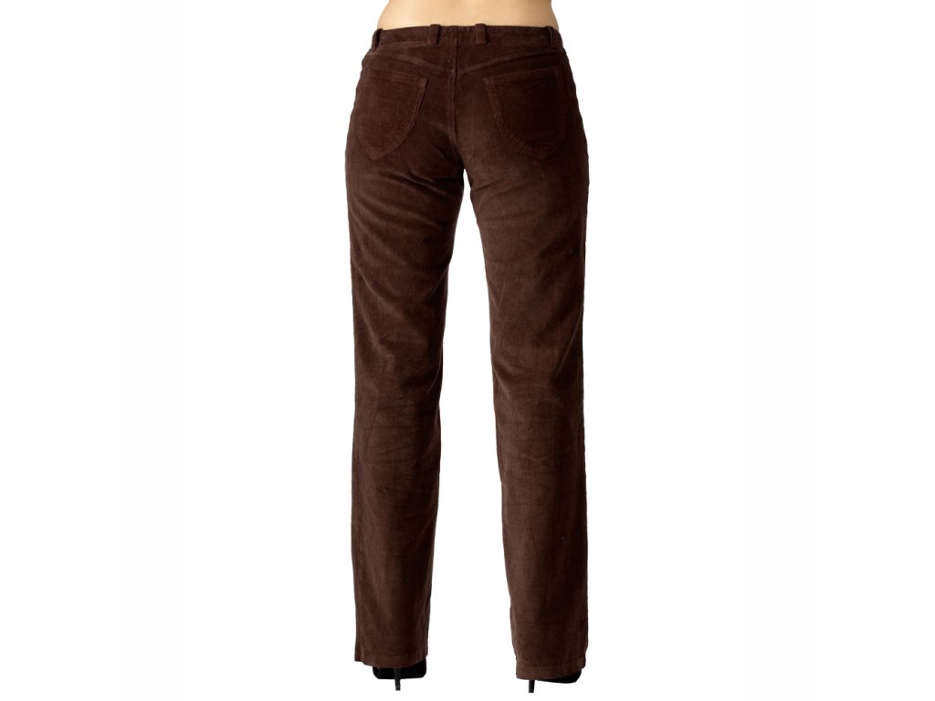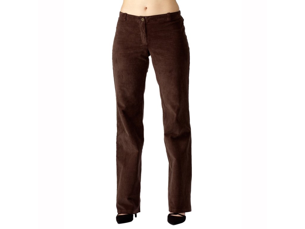 Dámske menčestrové nohavice tmavo hnedej farby s rovnými nohavicami. Dolný obvod nohavíc pri veľkosti 36 je 46 cm. Predný diel je bez členenia, zadný diel je členený sedlom a sú tu našité vrecká. Oblasť pása je zapravená tvarovanou podsádkou a je doplnená pútkami. Menčester s jemným rebrovaním.