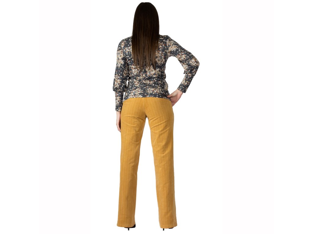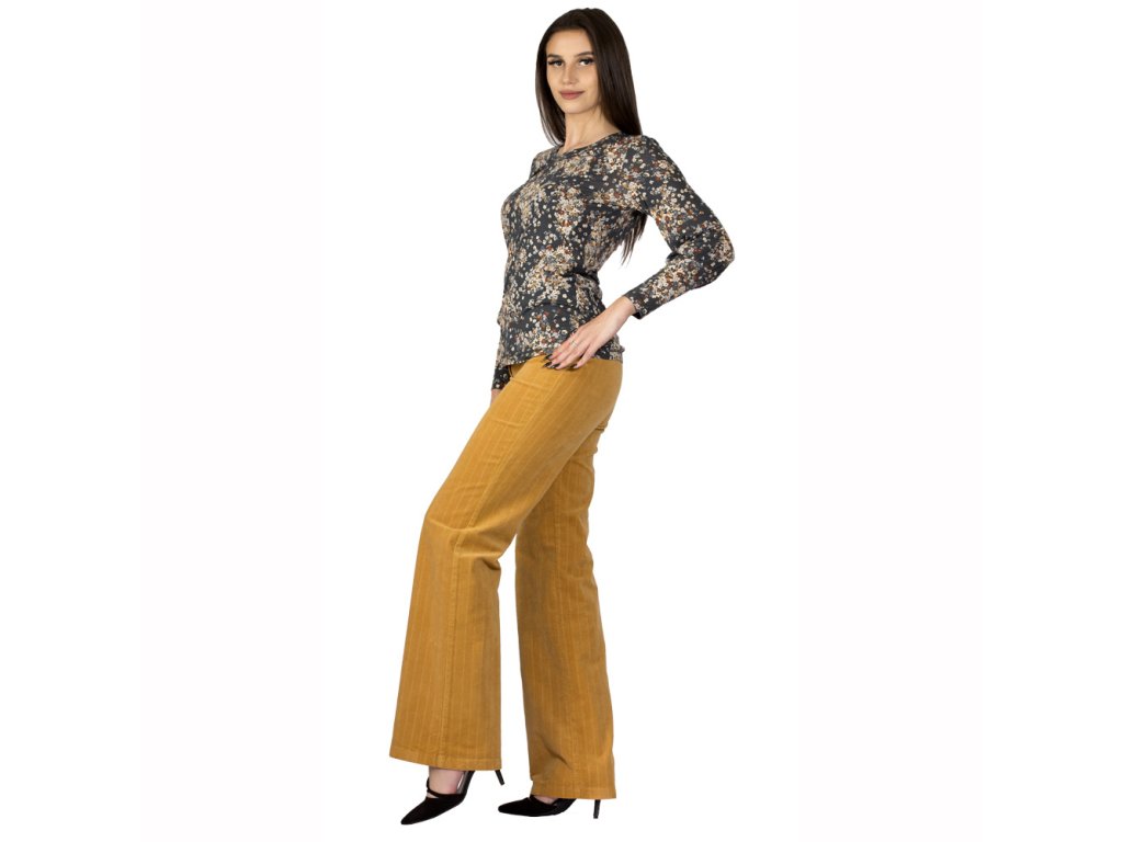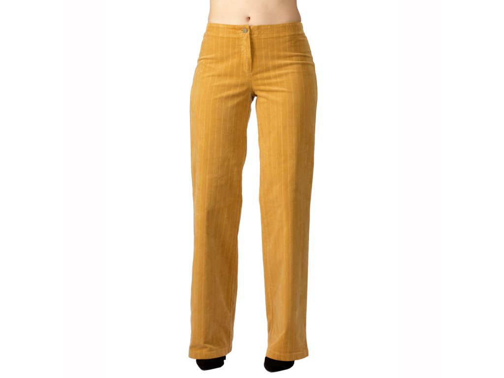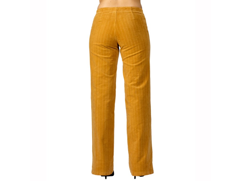 Dámske menčestrové nohavice okrovej farby s rovnými, voľnými nohavicami. Dolný obvod nohavíc pri veľkosti 42 je 46 cm. Predný diel je bez členenia, na zadnom diele odšité pásové záševky. Oblasť pása je zapravená tvarovanou podsádkou. Menčester s jemným rebrovaním do vzoru "stromčeka".
