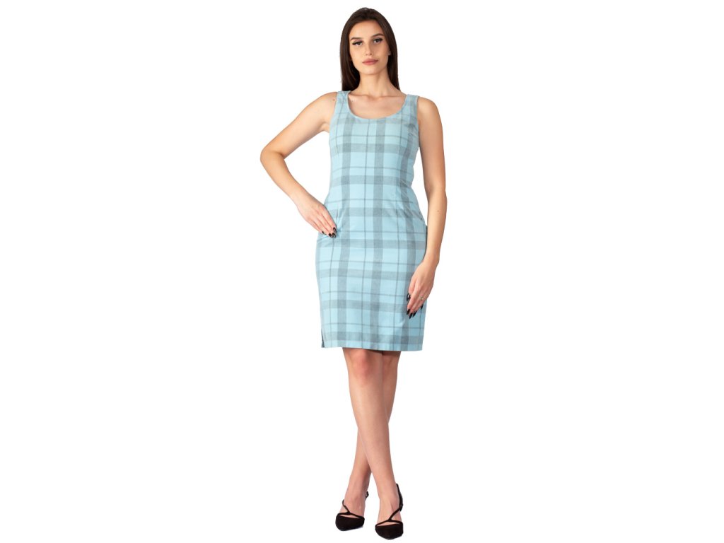 Dámske priliehavé puzdrové šaty s okrúhlym výstrihom. Na prednom diele odšité prsné a pasové záševky, na zadnom pasové záševky. V pravom bočnom šve je rázporok pre voľnosť, v ľavom všitý skrytý zips pre pohodlné obliekanie. Vyrobené z jemného menčestra svetlo modrej farby s vytkaným vzorom kociek. V letné dni je možné ich nosiť samostatne, alebo v zimných dňoch v kombinácii napríklad s rolákom a pančucháčmi. Šaty sú možné nosiť po celý rok.