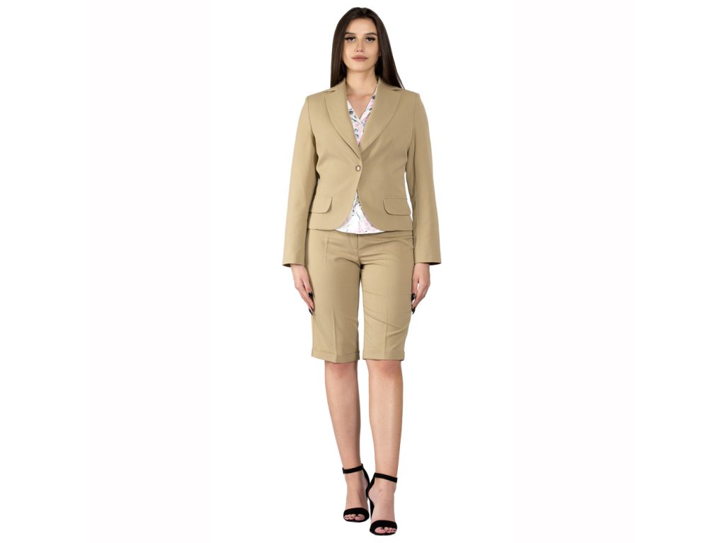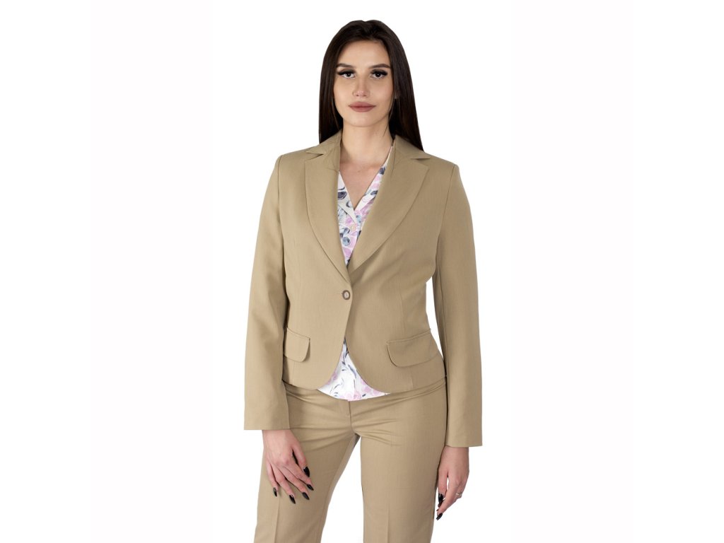 Dámske vypodšívkované oblekové sako s klasickou fazónou, zapínané na jeden gombík. Na prednom diele sú odšité pásové záševky a našity ozdobné pätky. Zadný diel je členený stredovým a bočnými členiacimi švami. Rukáv dvojšvový. Vyrobené zo zmesového materiálu okrovo béžovej farby. Vhodné na kombináciu s kraťasmi Roubaix, ale môžete ho nosiť aj k rifliam. Sako vám dodá ten správny "šmrnc".