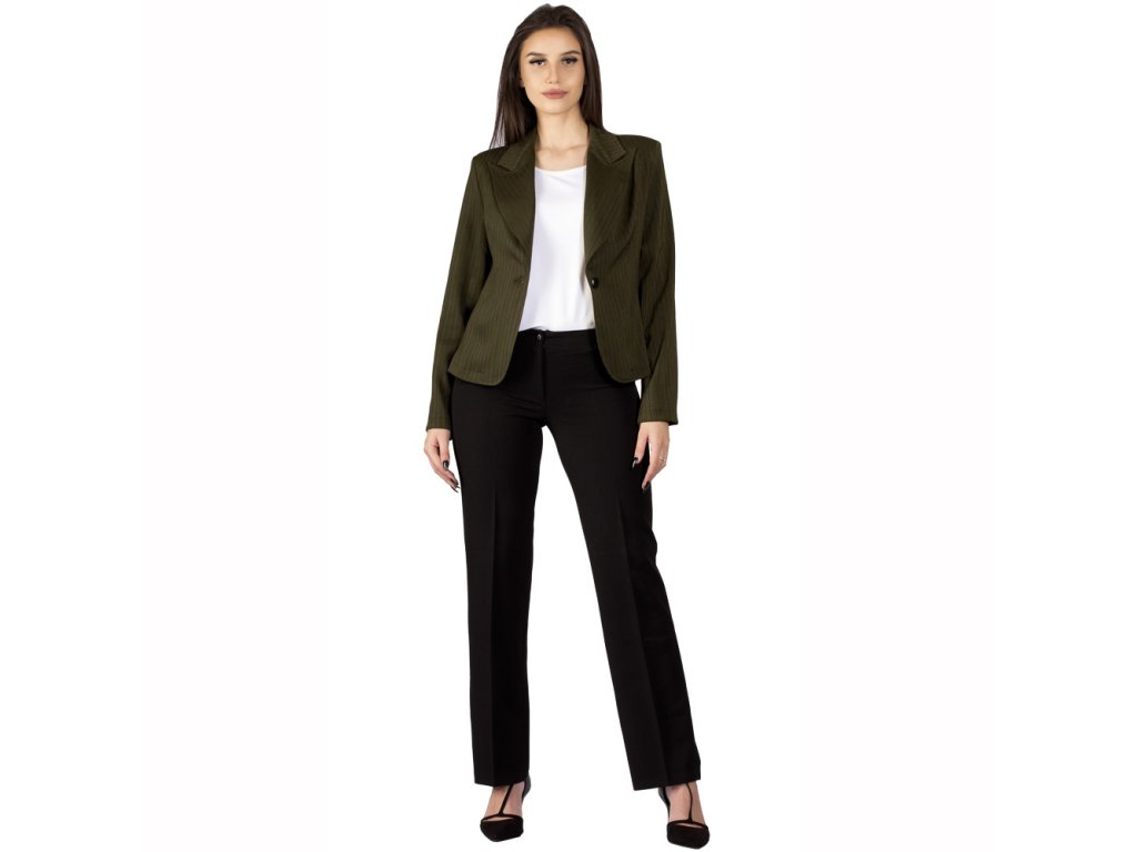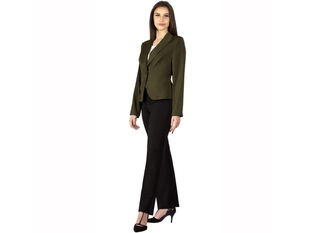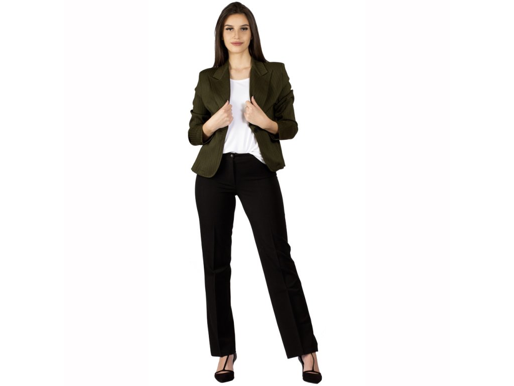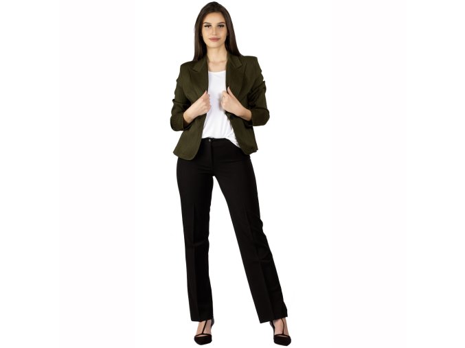 Ľahké dámske nepodšité sako priliehavé siluety. Sako je so špicatou fazónou, zapínané na jeden gombík. Na prednom diele sú odšité šikmé pásové záševky. Zadný diel je členený stredovým a bočnými členiacimi švami. Rukávy dvojšvové. Vyrobené zo zmesového materiálu nenáročného na údržbu s prímesou lycry. Môžete ho nosiť ako k elegantným nohaviciam do kancelárie, tak aj neformálne k rifliam. Sako vám dodá ten správny šmrnc!