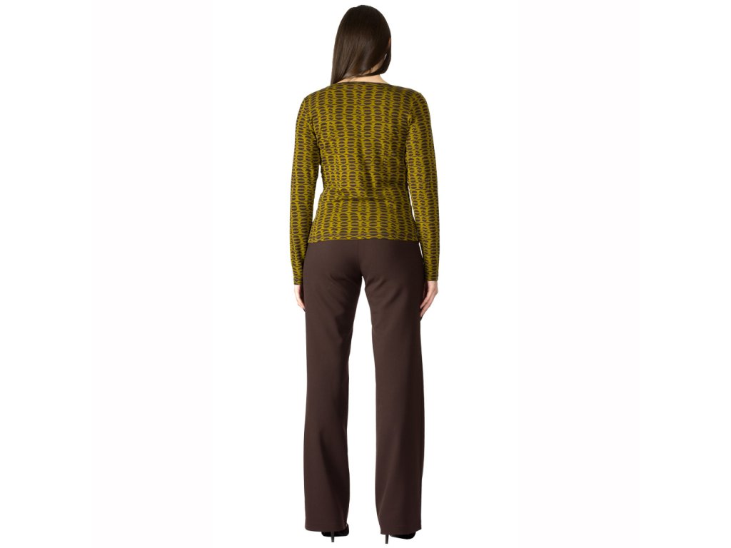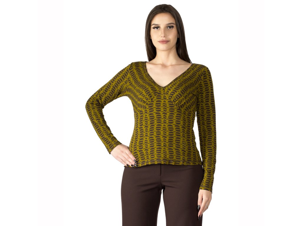 Elegantné dámske tričko s dlhými rukávmi je vyrobené z viskózového úpletu olivovo zelenej farby s hnedým vzorom, ktorý pripomína kávové zrnká. Výstrih do V a zaujímavo riešený predný diel s riasením pod prsiami.