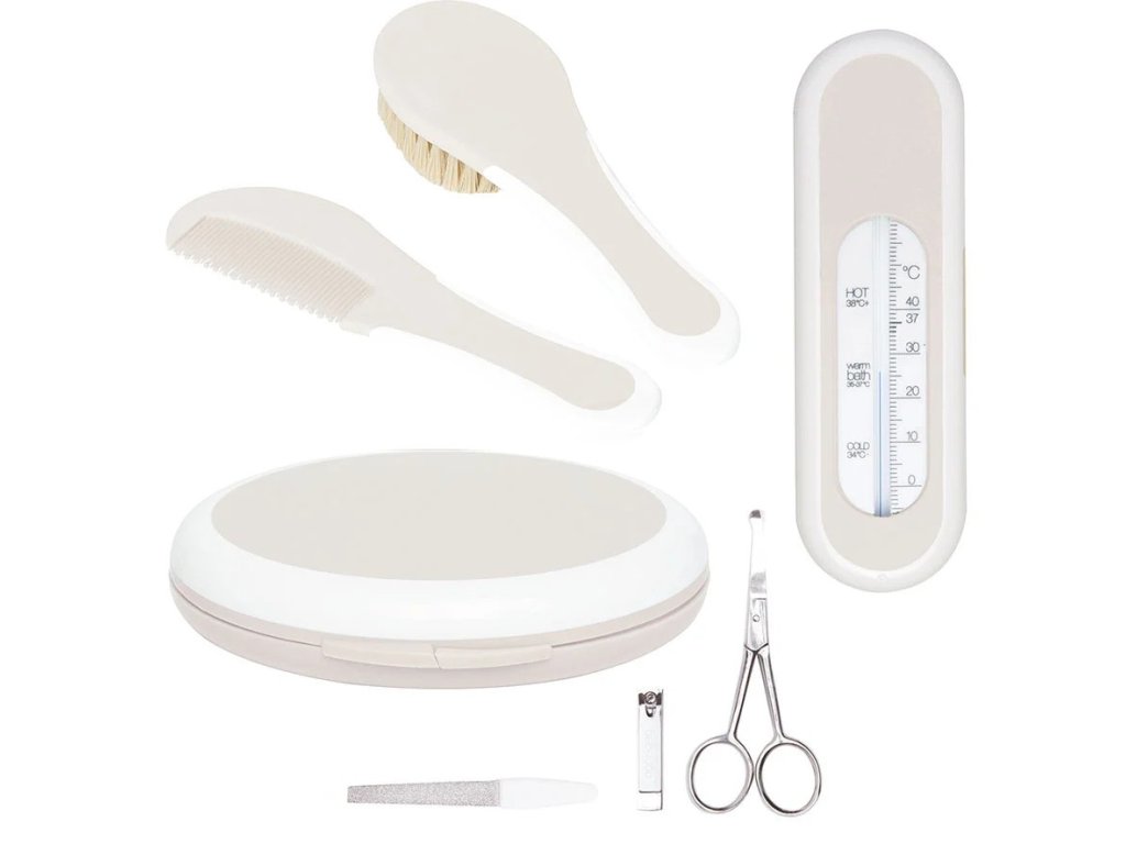 Roztomilá štvordielna darčeková sada poteší novopečených rodičov hneď niekoľkokrát. Prvýkrát, keď ju dostane a potom zakaždým, keď ju budú používať. Nie je to len krásny darček, ale aj veľmi praktická, krásne zabalená sada. Obsahuje kúpací teplomer, manikúru, hrebeň a kefu.