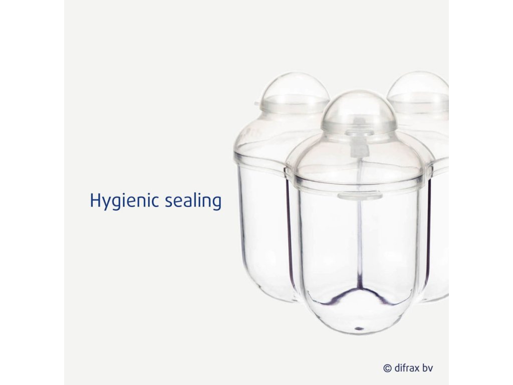 S dávkovačom sušeného mlieka Difrax môžete so sebou na cesty pribaliť až tri porcie mlieka. Do každej z troch častí dávkovača vojde 9 lyžíc mlieka v prášku, ktoré vystačia na 3 x 210 ml mlieka.