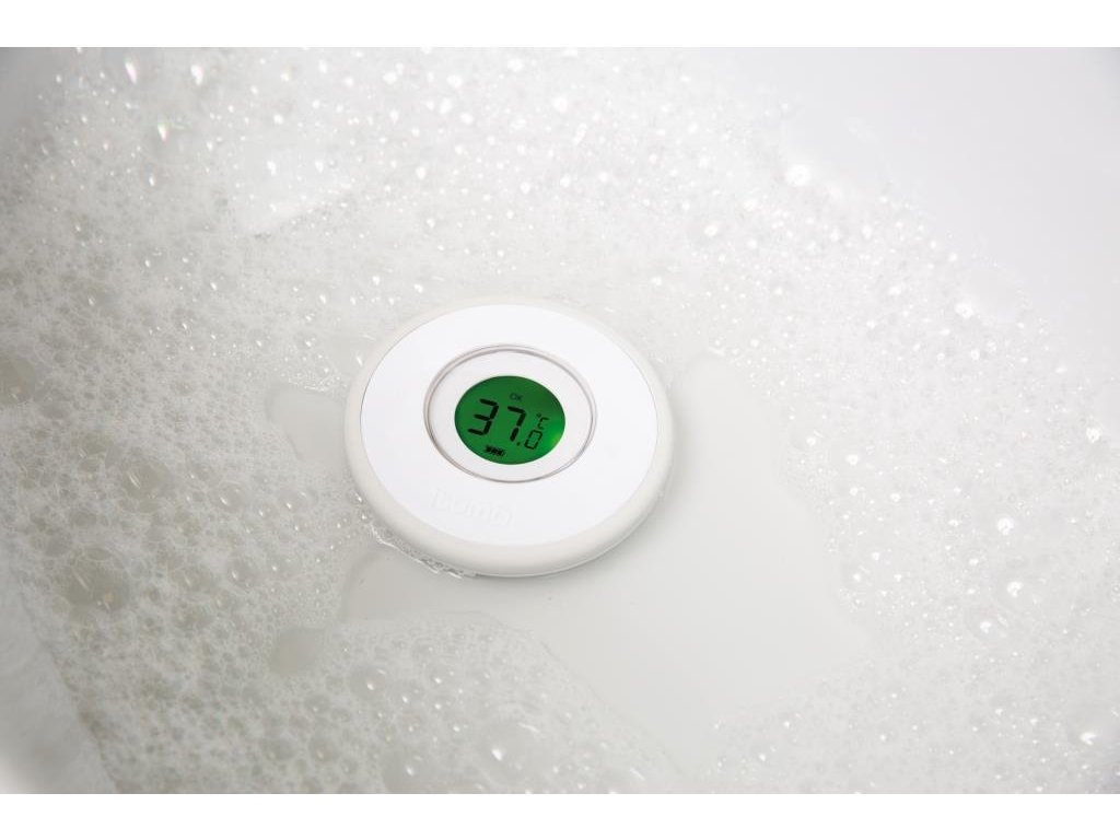 Digitálny kúpací teplomer LUMA sa automaticky aktivuje, keď príde do kontaktu s vodou a pláva tak, aby bolo možné spoľahlivo vidieť displej. Modrá znamená príliš chladno, červená znamená príliš teplo a zelená je akurát. Okrem farebného indikátora je možné odčítať presnú teplotu vody. Na displeji je tiež indikátor stavu batérie. Teplomer sa po použití automaticky vypne. Teplomer môžete ľahko vyčistiť, snímte viečko, utrite ho a je čistý.