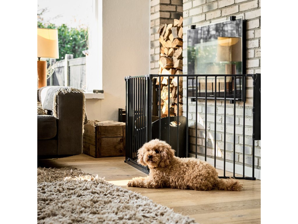 Dverná časť pri bránke DogSpace Max je mimoriadne široká a pri zostavovaní ju môžete umiestniť, kamkoľvek budete chcieť. Uprostred alebo na jednu zo strán. To záleží len na vás. Dvierka sa ľahko otvárajú jednou rukou (ale nie labkami) a otvárajú sa oboma smermi.