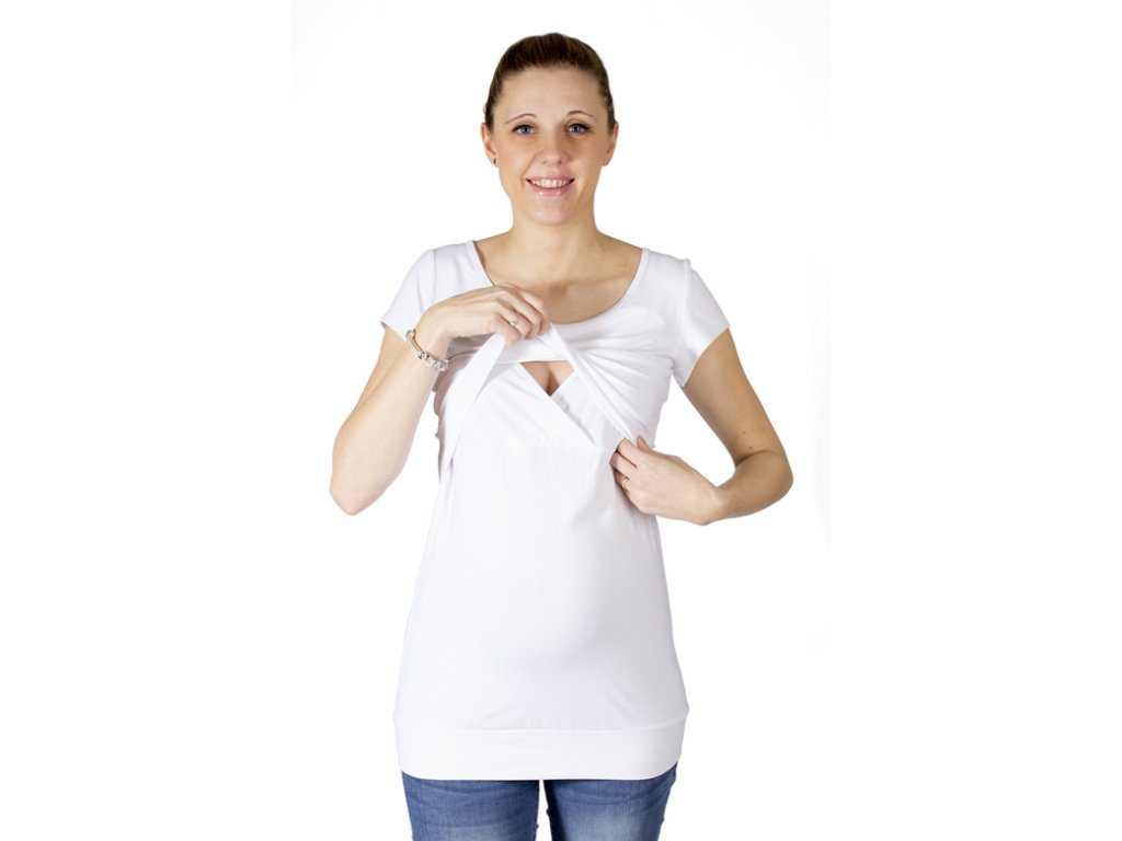 Dojčiace a tehotenské tričko s väčším okrúhlym výstrihom a krátkymi rukávmi. Predný diel je podstrihnutý pod prsiami. Cez preložené (prekrížené) dojčiace vsadky je umiestnený vrchný "krycí" diel, ktorý poskytuje súkromie pri dojčení. Tento krycí diel je zakončený širším lemom, takže pekne kopíruje postavu a neodstáva. Výstrih a dojčiace vsadky sú zapravené lemovacími prúžkami. Dolný kraj trička je všitý do pružnej manžety. Vzhľadom k použitému materiálu je tričko veľmi príjemné pri nosení.