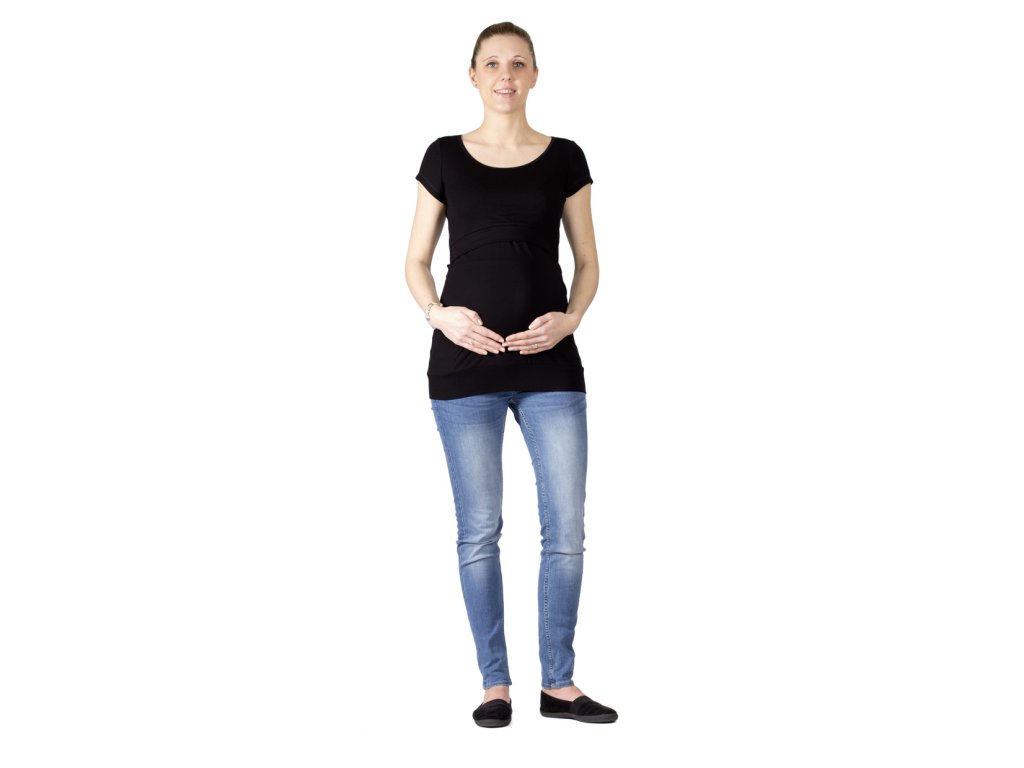 Dojčiace a tehotenské tričko s väčším okrúhlym výstrihom a krátkymi rukávmi. Predný diel je podstrihnutý pod prsiami. Cez preložené (prekrížené) dojčiace vsadky je umiestnený vrchný "krycí" diel, ktorý poskytuje súkromie pri dojčení. Tento krycí diel je zakončený širším lemom, takže pekne kopíruje postavu a neodstáva. Výstrih a dojčiace vsadky sú zapravené lemovacími prúžkami. Dolný kraj trička je všitý do pružnej manžety. Vzhľadom k použitému materiálu je tričko veľmi príjemné pri nosení.
