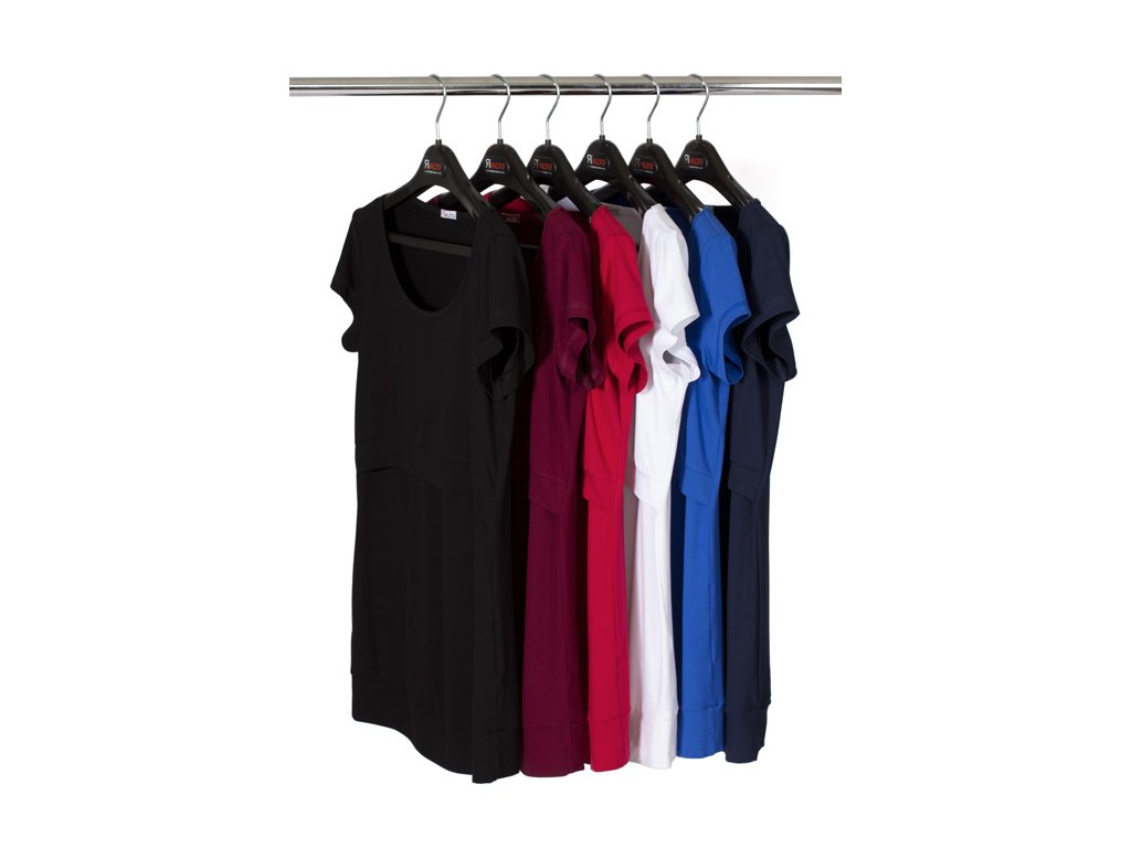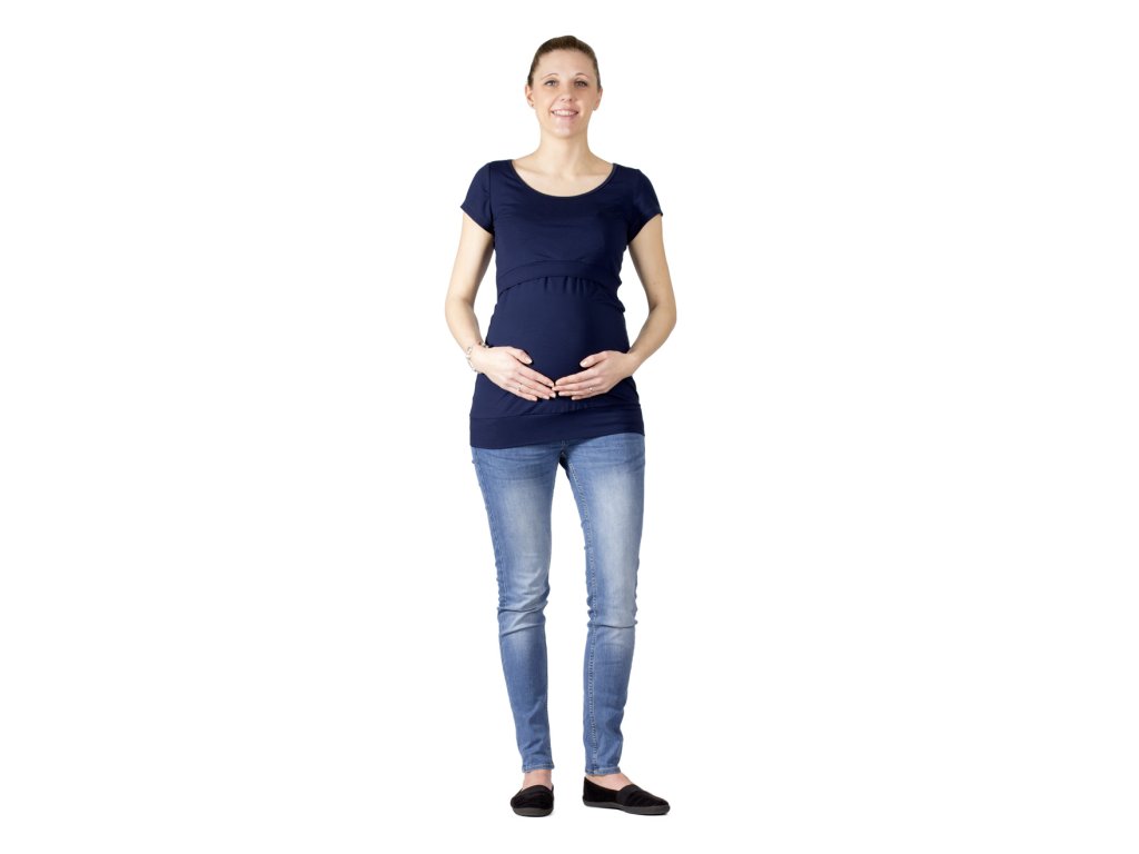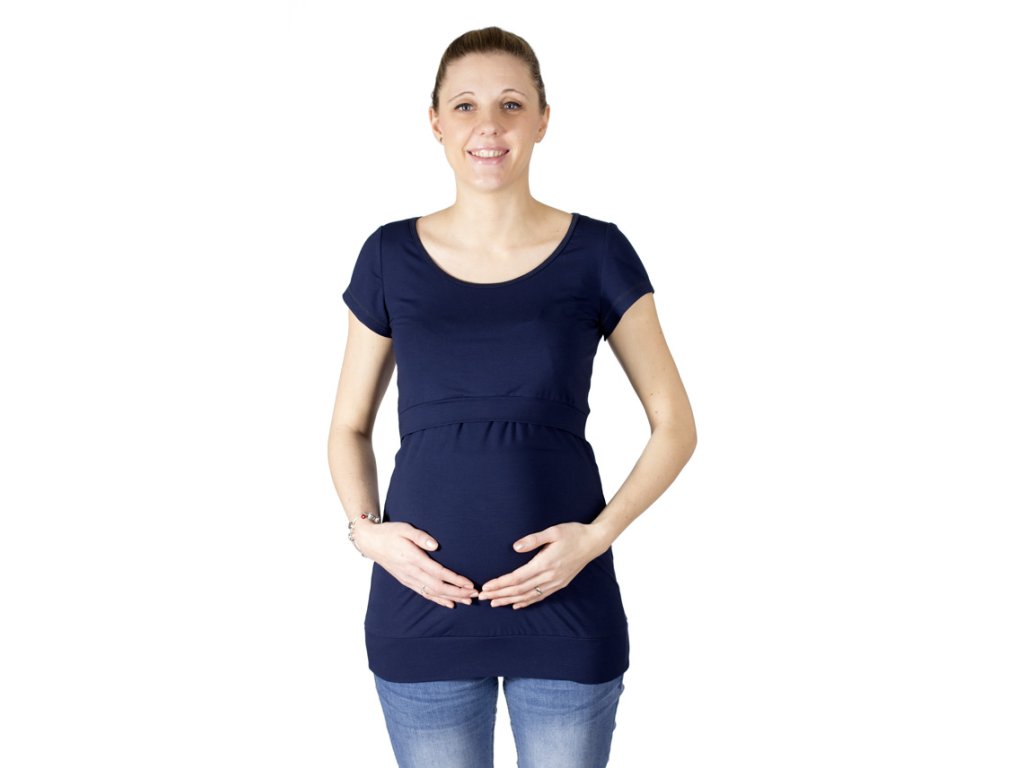 Dojčiace a tehotenské tričko s väčším okrúhlym výstrihom a krátkymi rukávmi. Predný diel je podstrihnutý pod prsiami. Cez preložené (prekrížené) dojčiace vsadky je umiestnený vrchný "krycí" diel, ktorý poskytuje súkromie pri dojčení. Tento krycí diel je zakončený širším lemom, takže pekne kopíruje postavu a neodstáva. Výstrih a dojčiace vsadky sú zapravené lemovacími prúžkami. Dolný kraj trička je všitý do pružnej manžety. Vzhľadom k použitému materiálu je tričko veľmi príjemné pri nosení.