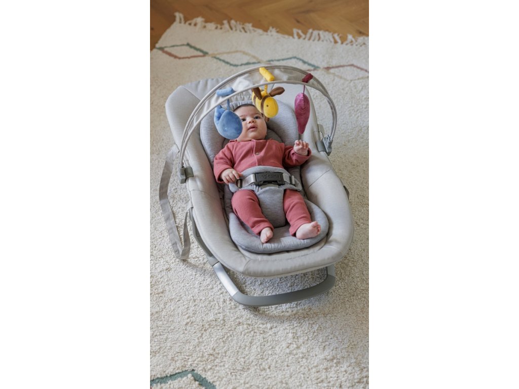 Lounge obsahuje: • Hojdacie lehátko • Podporu hlavičky pre prvé mesiace života • Hrazdu s 3 mäkkými, pestrofarebnými hračkami • Hudobnú skrinku s tromi melódiami