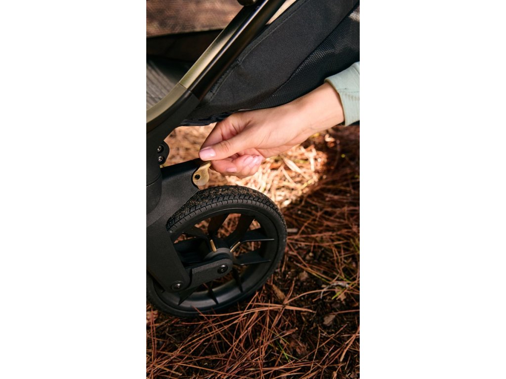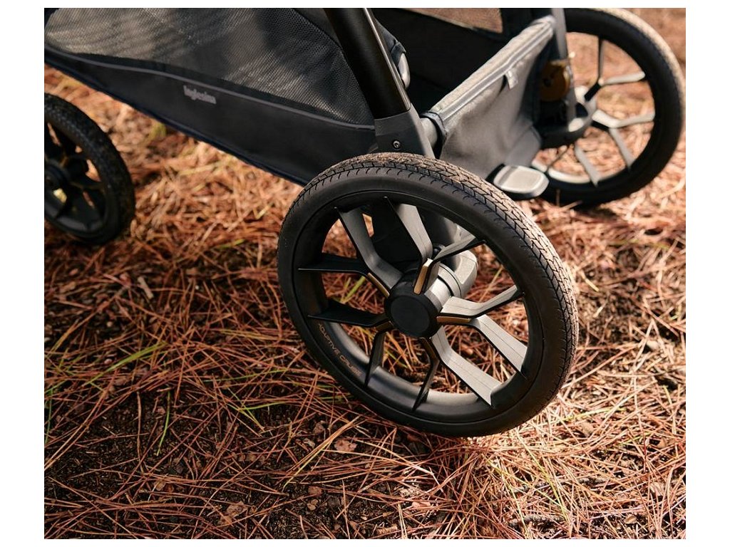Nový rozmer pohodlia a ochrany Pre podvozok Aptica XT vyvinula Inglesina úplne nové kolesá. Sú väčšie (215 mm predné kolesá a 290 mm zadné kolesá), majú špeciálny tvar, ktorý prispieva k pohlcovaniu drobných rázov od nerovností cesty. Vlastné obruče kolies sú tvorené vonkajšou tvrdou gumou, zaisťujúcou dlhú životnosť kolies, a dvojvrstvovou výplňou z penového polyuretánu, ktorá rovnako ako sofistikovaný tvar kolies pohlcuje rázy a vibrácie od nerovností povrchu cesty. Jazda je potom príjemnejšia pre dieťa aj pre rodičov, ktorým sa do rukoväte kočíka prenáša oveľa menej vibrácií.