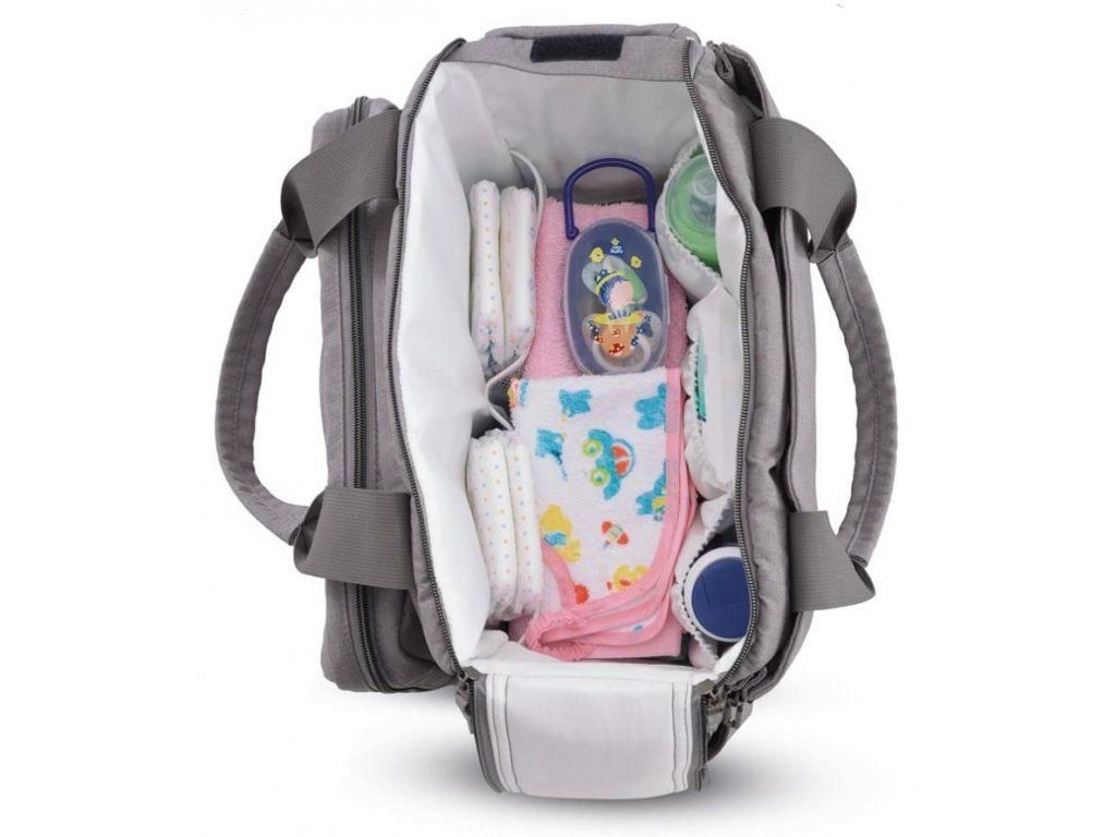 MULTIFUNKČNÁ TAŠKA s veľkými priehradkami, ktorá pojme všetko, čo rodičia pre svoje dieťa na cestách potrebujú mať po ruke. Vybavená prebaľovacou podložkou a odnímateľnou priestrannou listovou kabelkou, ktorá je ideálna pre krátke výlety.