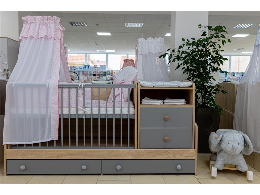 Alebo môžete postieľku rozdeliť na 3 samostatné prvky: detská postieľka s vnútornými rozmermi 120 x 70 cm, na malú skrinku(š. 55 cm, hl. 80 cm, výška 74 cm) a na váľandu s rozmermi 180 x 80 cm.