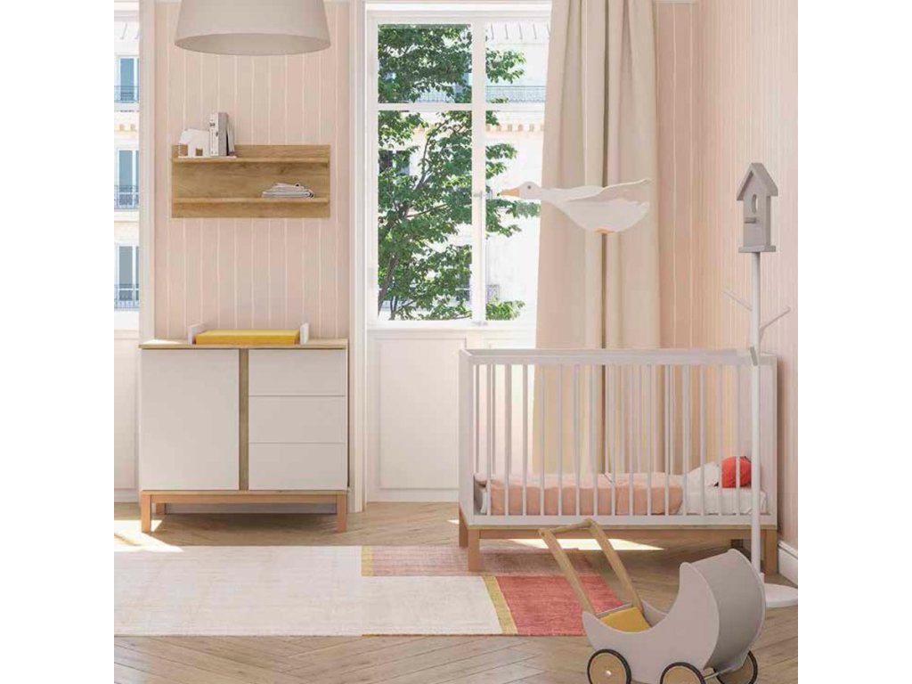 Dôležitá súčasť detskej izby. Bola navrhnutá tak, aby sa zmestila do relatívne malého priestoru, ale napriek tomu ponúkla novopečeným rodičom tú najväčšiu možnú pomoc. Jej výška, úložné plochy a variabilita boli navrhnuté na základe skúseností rodičov. Slúži nielen ako úložný priestor, ale hornú časť komody je možné po dokúpení nástavca na komodu využiť ako prebaľovací pult.