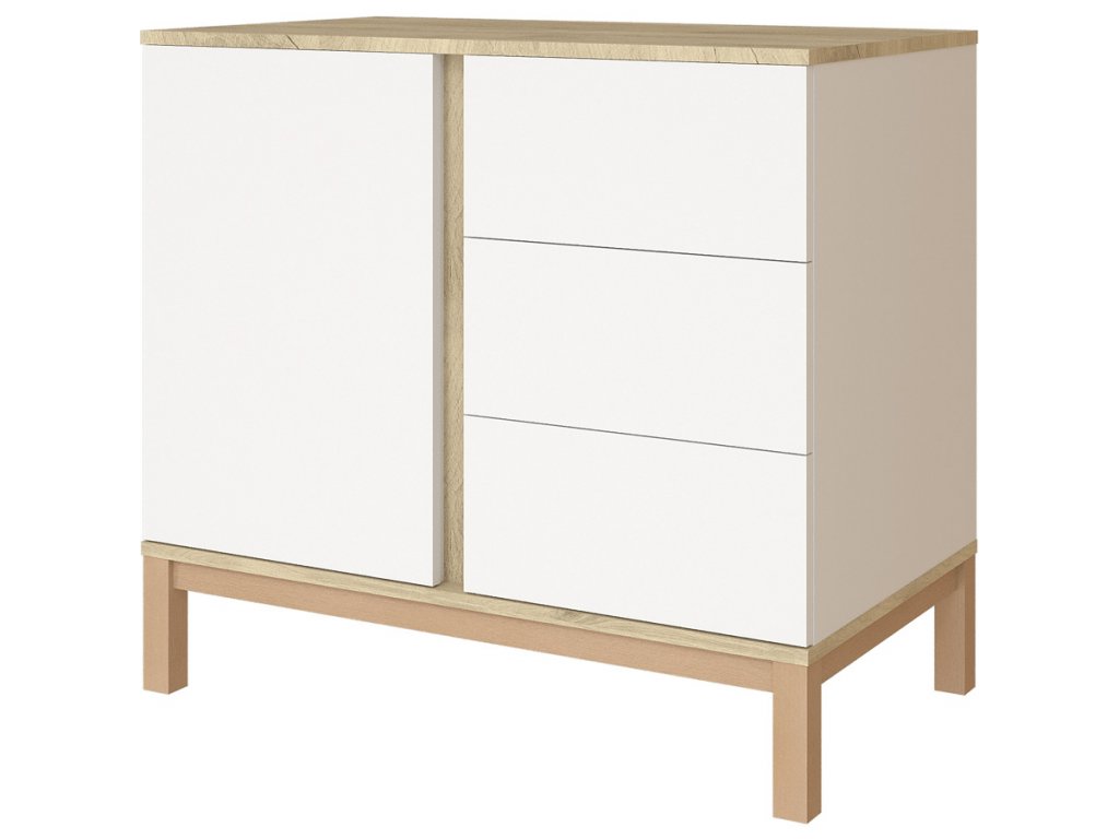 Dôležitá súčasť detskej izby. Bola navrhnutá tak, aby sa zmestila do relatívne malého priestoru, ale napriek tomu ponúkla novopečeným rodičom tú najväčšiu možnú pomoc. Jej výška, úložné plochy a variabilita boli navrhnuté na základe skúseností rodičov. Slúži nielen ako úložný priestor, ale hornú časť komody je možné po dokúpení nástavca na komodu využiť ako prebaľovací pult.