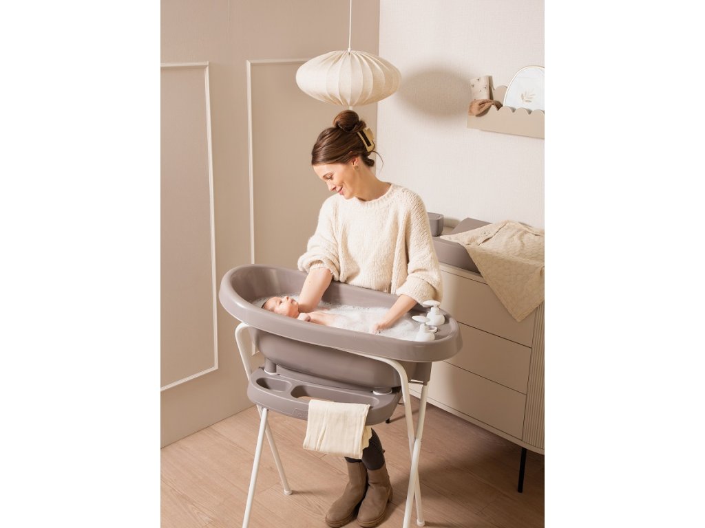 Kúpanie bábätka patrí k najobľúbenejším večerným rituálom. Ak máte stojan, nemusí sa nutne odohrávať v kúpeľni. Niekedy trvá dlhšie, a tak je dôležitá správna výška vaničky na správne držanie tela, a tiež mať všetko na dosah a nemusieť od kúpaného dieťaťa odchádzať. Stojan Click od Bébé-jou je preto vybavený integrovaným držiakom uteráka alebo župana a miestom na položenie mydla alebo kúpacích gélov a šampónov. Nikdy nenechávajte dieťa pri kúpaní bez dozoru.