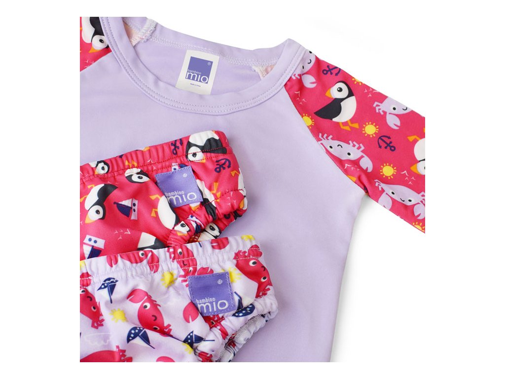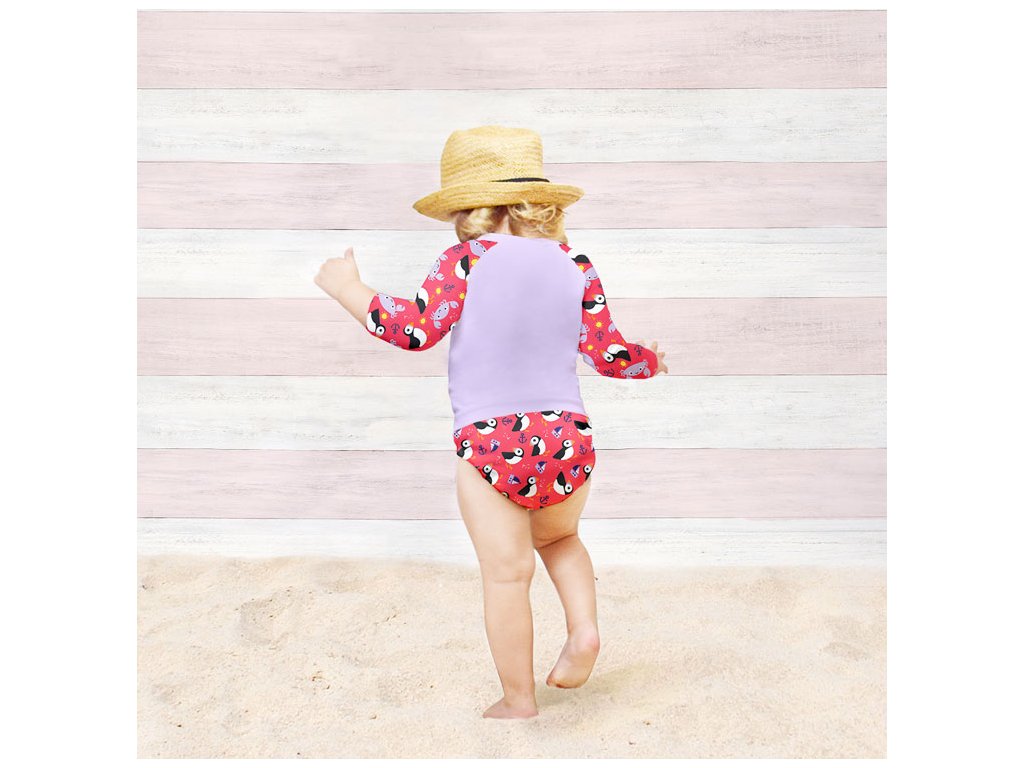 - Odolný materiál a dlhé rukávy poskytujú ochrannú vrstvu proti slnku, piesku, vode a možným odreninám na pokožke dieťaťa.