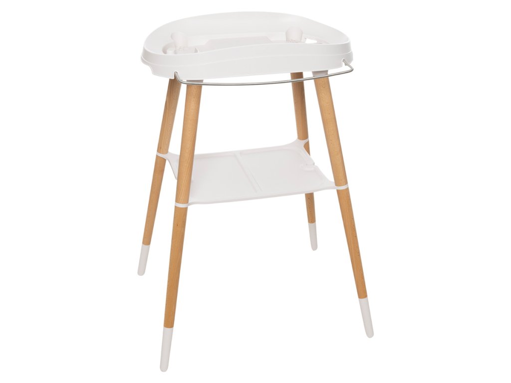 Veľmi stabilný vaňový stojan Sense má nohy vyrobené z lakovaného bukového dreva s certifikáciou FSC. To dodáva stojanu teplý moderný vzhľad. Je vybavený praktickými pomôckami; vpredu je pripevnený držiak na uteráky. Priestranná plastová polička poskytuje dostatok miesta napríklad na šampón, žinku, vodné hračky alebo kúpací gél. To znamená, že máte po ruke všetky potrebné veci, aby ste si s malým mohli v pokoji kúpanie užiť. Inovatívny systém upevnenia zaisťuje, že vaňu možno ľahko pripevniť k stojanu a rovnako ľahko sňať. Po kliknutí môžete svoje bábätko nerušene a bezpečne kúpať.