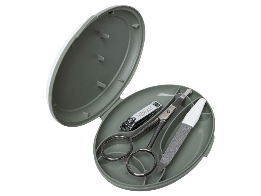 Obsahuje nožnice so zaguľatenými koncami, pilníček na nechty a tiež klieštiky na nechty. Všetko je vyrobené z nehrdzavejúcej ušľachtilej ocele. Krabička s výrazným motívom na viečku chráni pred prachom a pomáha udržiavať manikúru v čistote. Ale aj napriek tomu pred každým použitím jednotlivé nástroje starostlivo očistite a u novorodencov aj dezinfikujte roztokom liehu.