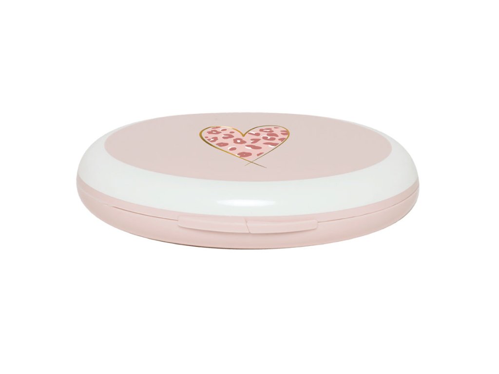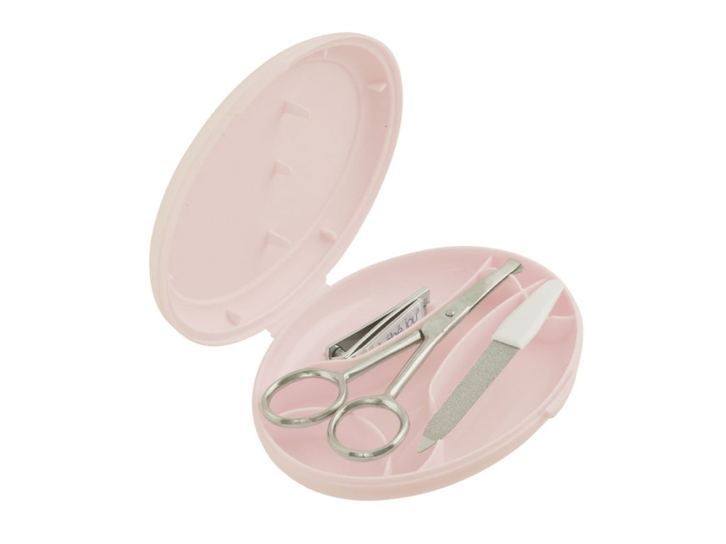 Obsahuje nožnice so zaoblenými koncami, pilník na nechty a tiež klieštiky na nechty. Všetko je vyrobené z nehrdzavejúcej ušľachtilej ocele. Krabička s výrazným motívom na viečku chráni pred prachom a pomáha udržiavať manikúru v čistote. Ale aj napriek tomu pred každým použitím jednotlivé nástroje dôkladne očistite a u novorodencov aj dezinfikujte roztokom liehu.