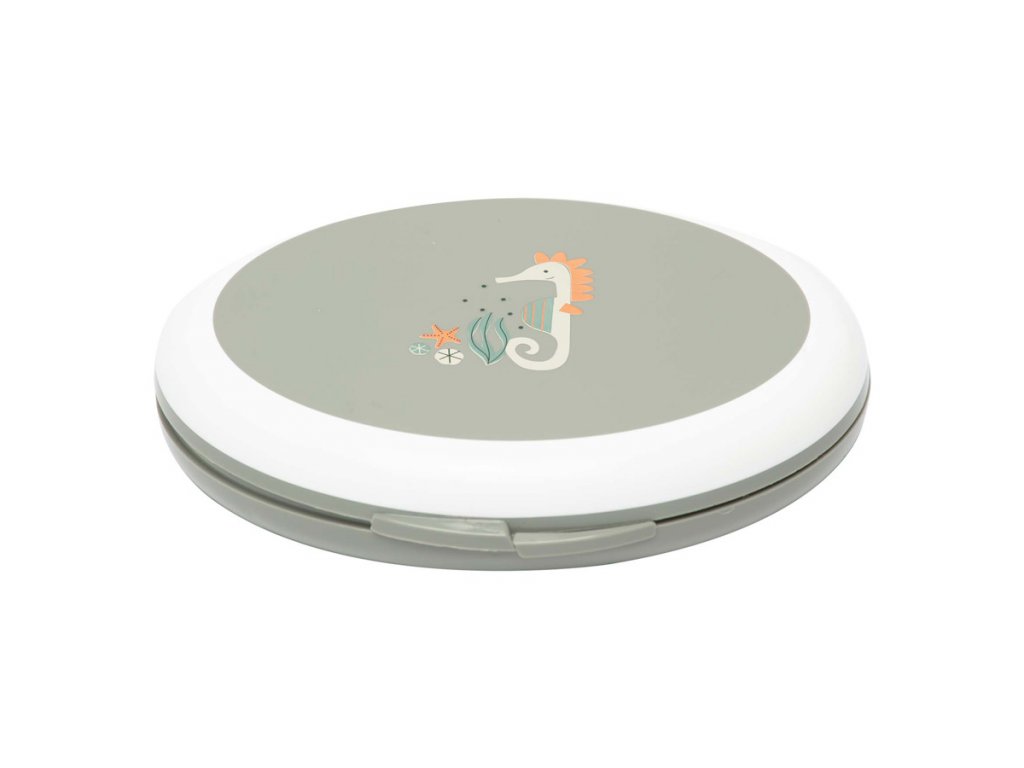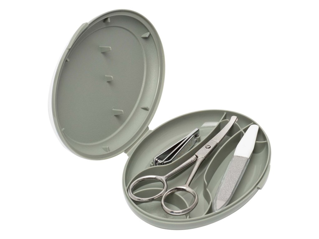 Obsahuje nožnice so zaguľatenými koncami, pilníček na nechty a tiež klieštiky na nechty. Všetko je vyrobené z nehrdzavejúcej ušľachtilej ocele. Krabička s výrazným motívom na viečku chráni pred prachom a pomáha udržiavať manikúru v čistote. Ale aj napriek tomu pred každým použitím jednotlivé nástroje starostlivo očistite a u novorodencov aj dezinfikujte roztokom liehu.