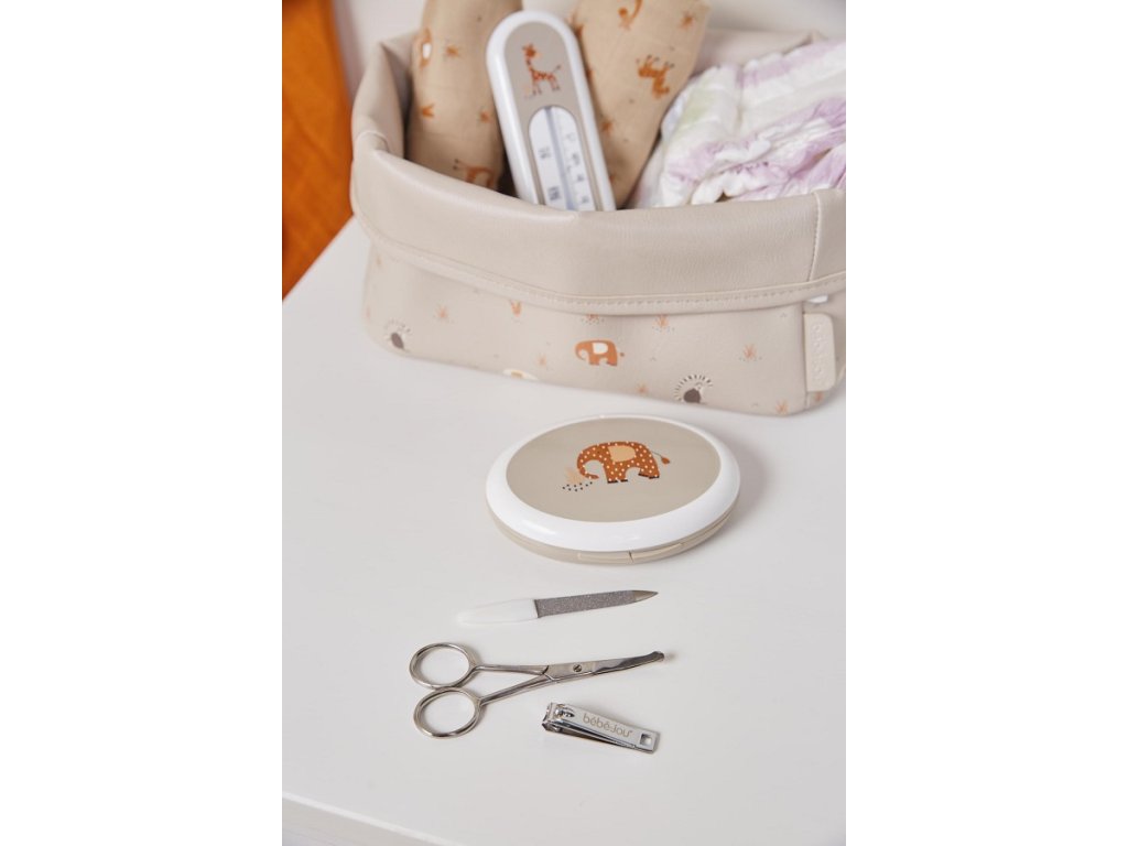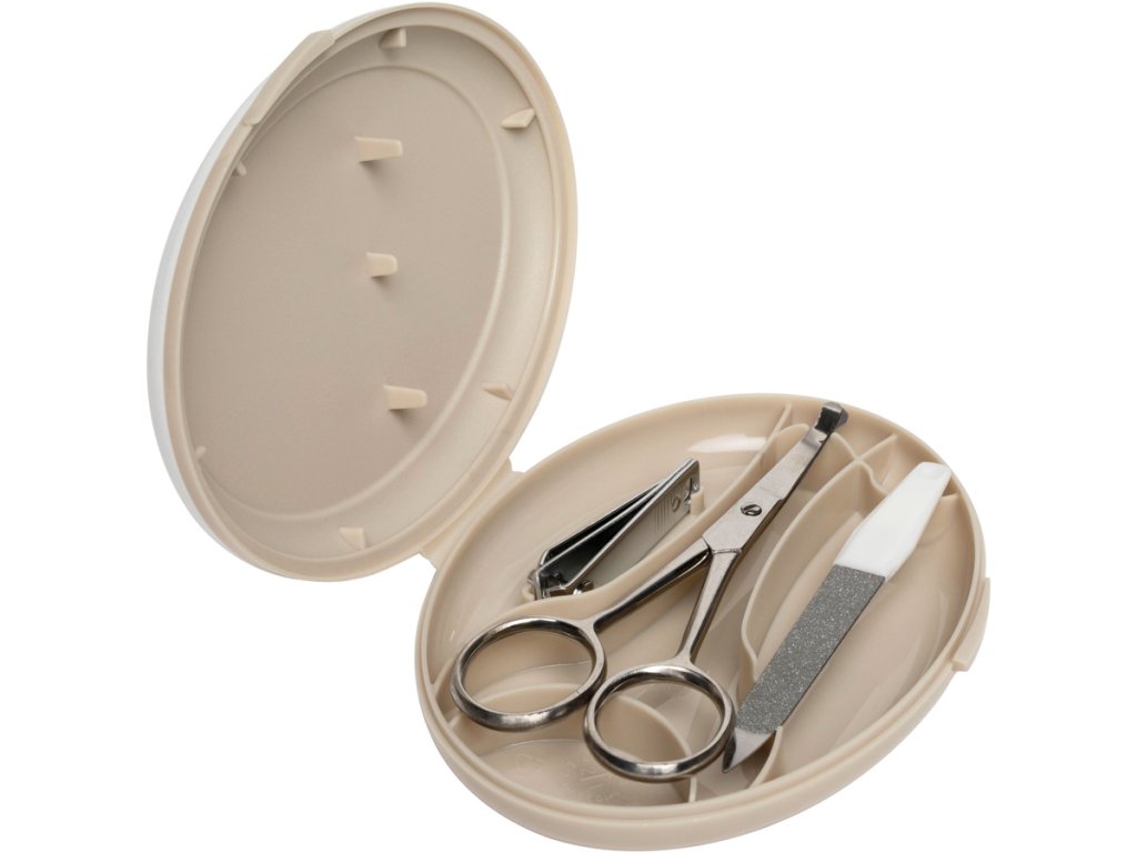 Obsahuje nožnice so zaoblenými koncami, pilník na nechty a tiež klieštiky na nechty. Všetko je vyrobené z nehrdzavejúcej ušľachtilej ocele. Krabička s výrazným motívom na viečku chráni pred prachom a pomáha udržiavať manikúru v čistote. Ale aj napriek tomu pred každým použitím jednotlivé nástroje dôkladne očistite a u novorodencov aj dezinfikujte roztokom liehu.
