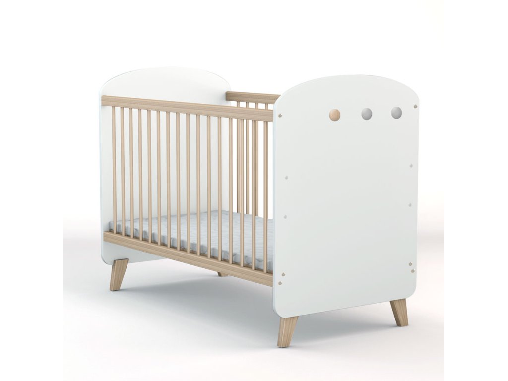 Moderná detská postieľka s čelami vyrobenými z laminovanej drevotriesky v bielom lesku a s nožičkami, bočnicami a s roštom z masívu.
