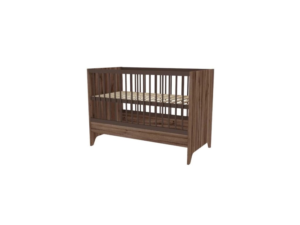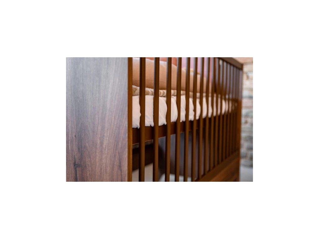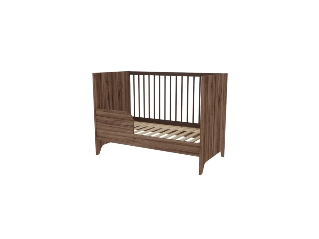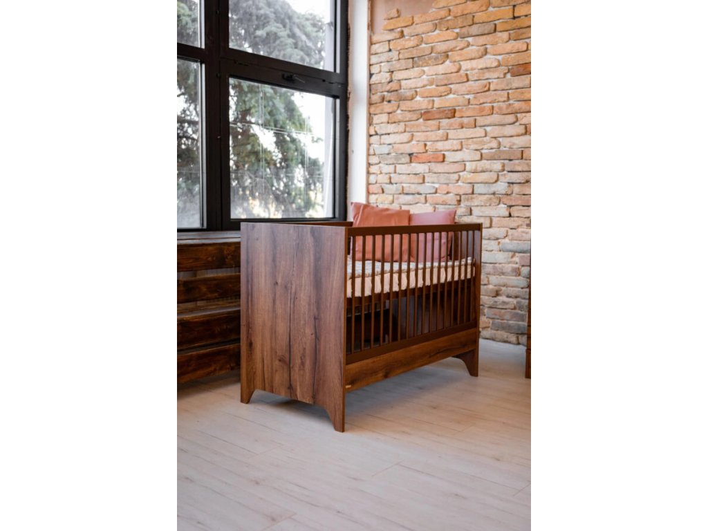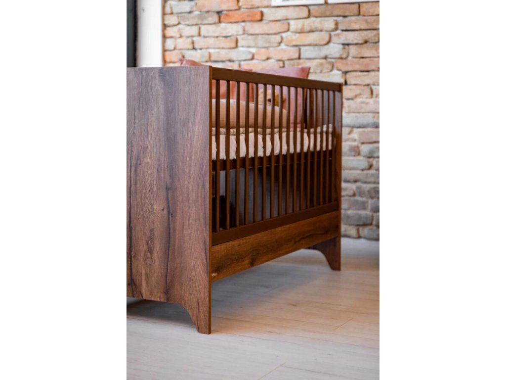 Detská postieľka Nest Walnut 120x60cm je základnou časťou modernej detskej izby. Povrchová úprava v odtieni tmavého orecha je zdobená špeciálnym čiernym žilkovaním, ktoré dodáva nábytku prírodný vzhľad a charakter.