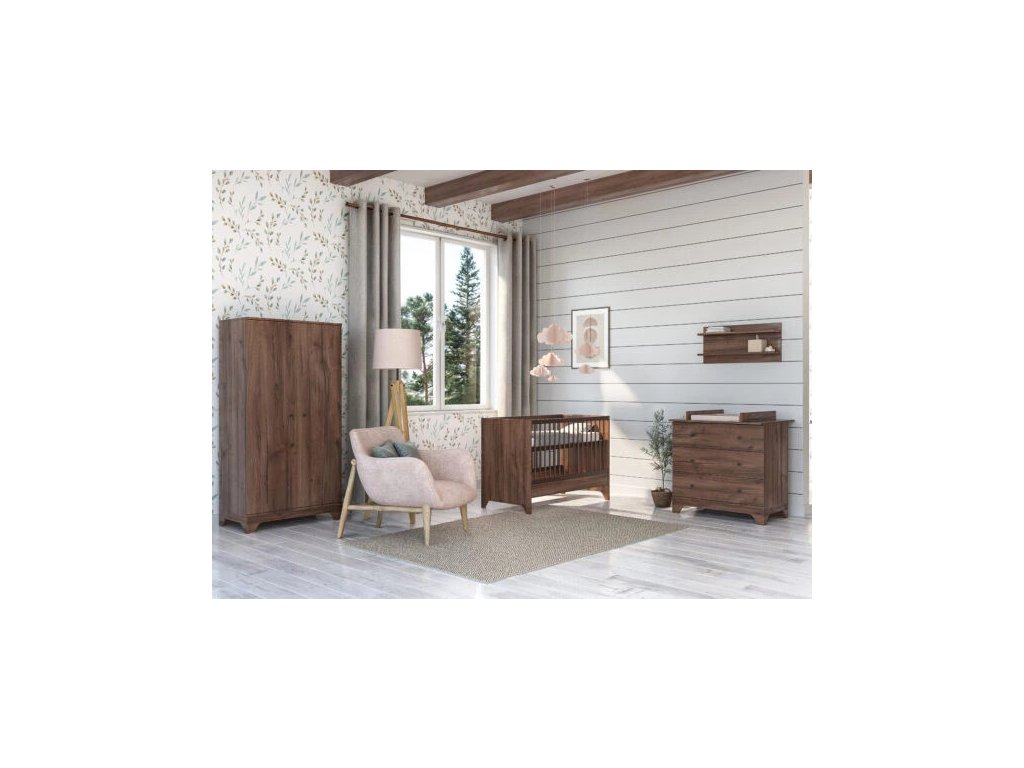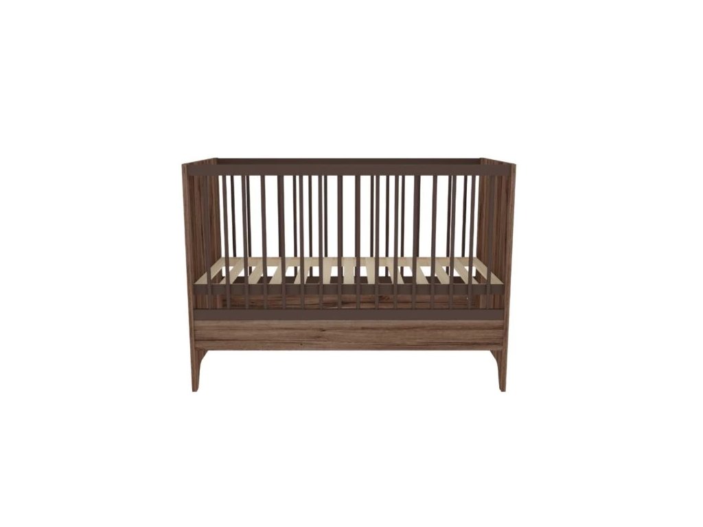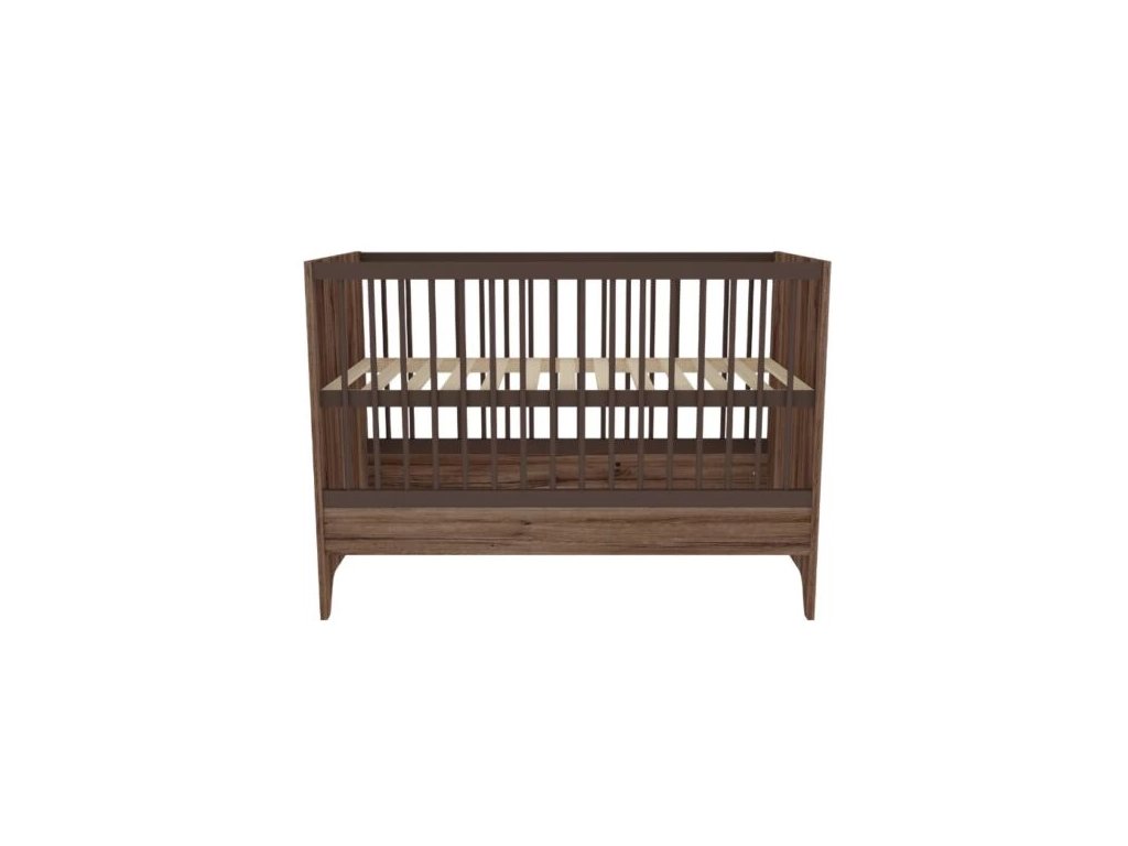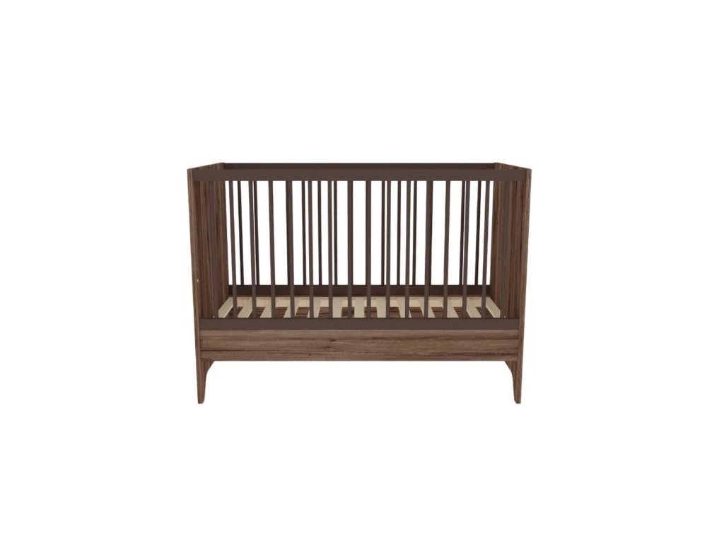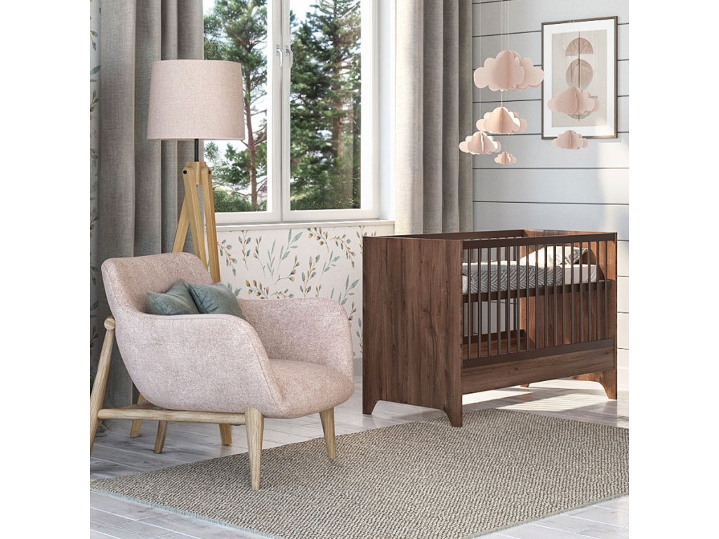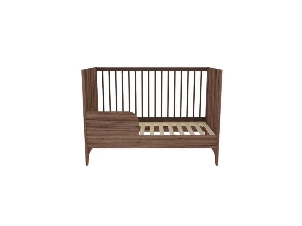 Detská postieľka Nest Walnut 120x60cm je základnou časťou modernej detskej izby. Povrchová úprava v odtieni tmavého orecha je zdobená špeciálnym čiernym žilkovaním, ktoré dodáva nábytku prírodný vzhľad a charakter.