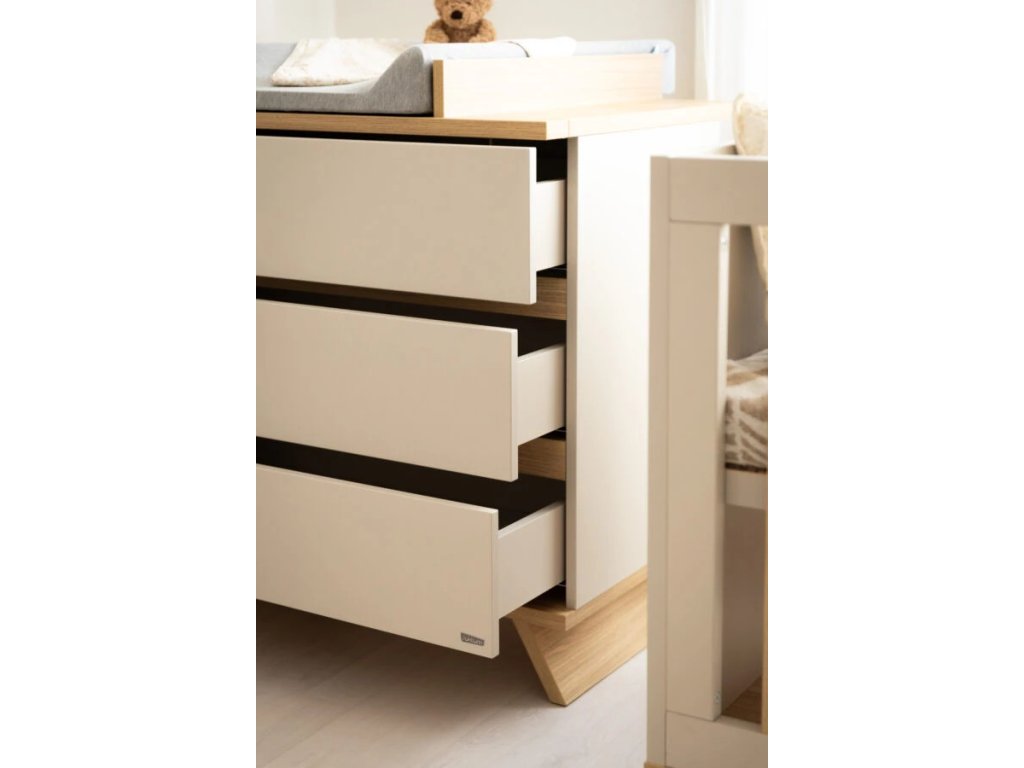 Jej výška, počet zásuviek a nosnosť z nej robí dôležitého spoločníka pre prvé obdobie. Komoda je štandardne dodávaná s prebaľovacím nástavcom, ktorý je nevyhnutný pre starostlivosť o dieťa v prvom roku života. Jeho neskorším odstránením zmeníte miesto na prebaľovanie na vynikajúci úložný priestor a komoda už bez nadstavca môže zostať štýlovým kúskom vo vašej domácnosti.