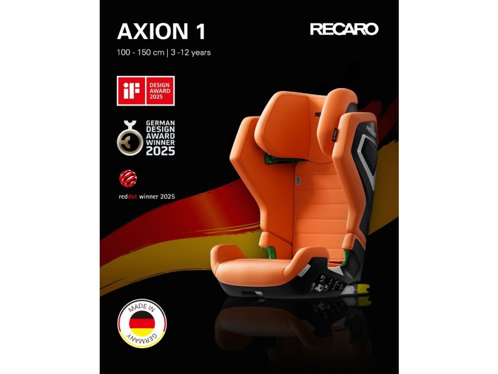 Úplne nová detská autosedačka Axion1 od nemeckej firmy Recaro vyniká pohodlím, priestorom a nízkou hmotnosťou. Jej dizajn vo svetlo šedej farbe redukuje jej ohrev v lete a pasuje do interiéru každého auta. Vzor na poťahu vyjadruje použité materiály a inováciu v oblasti bezpečnosti. Deťom od 100 do 150 cm čo zodpovedá cca 3-12 rokom ponúka maximálnu ochranu a vynikajúce pohodlie aj na najdlhších cestách. Rodičom nízku hmotnosť a veľmi jednoduchú inštaláciu v smere jazdy.