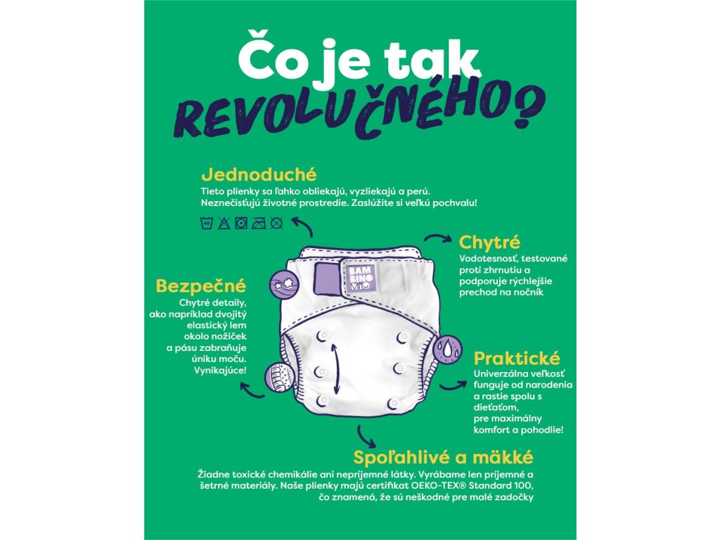 - Revolučné opakovane použiteľné plienky - neobsahujú škodlivé materiály a sú vybavené nastaviteľnými cvočkami, priedušnými absorpčnými tkaninami, vodeodolnou vrstvou a nepriepustnou konštrukciou.