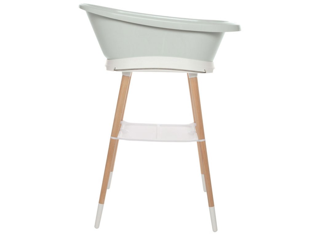 Veľmi stabilný stojan Sense má nohy vyrobené z bukového dreva s certifikáciou FSC. To dodáva stojanu teplý, moderný vzhľad. Je vybavený praktickými pomôckami: vpredu je pripevnený držiak na uteráky. Priestorná plastová polička poskytuje dostatok miesta napríklad pre šampón, žinku, vodné hračky či kúpací gel. To znamená, že máte po ruke všetky potrebné veci, aby ste si s dieťatkom mohli pokojne užiť kupkanie. Inovativný systém upevnenia zaisťuje, že vaňa sa dá jednoducho pripevniť k stojanu a rovnako jednoducho dať dole. Po kliknutí môžete svoje dieťatko nerušene a bezpečne kúpať.