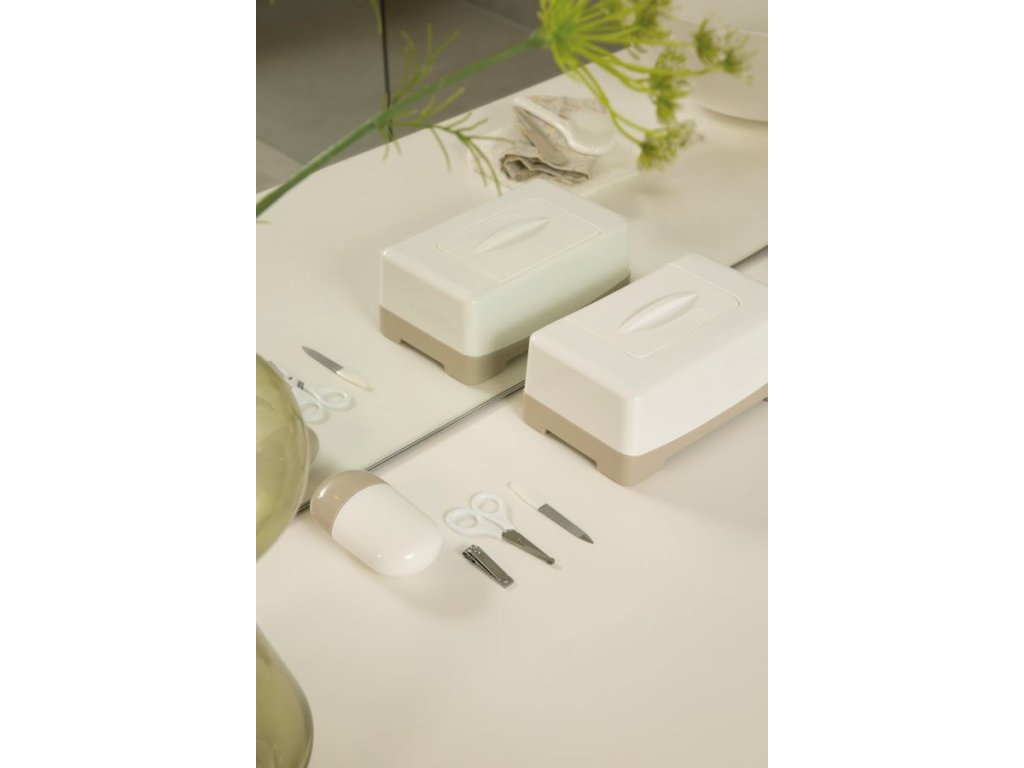 Manikúra obsahuje nožnice so zaguľatenými koncami, pilníček na nechty a tiež klieštiky na nechty. Všetko je vyrobené z nehrdzavejúcej ušľachtilej ocele. Krabička chráni pred prachom a pomáha udržiavať manikúru v čistote. Ale aj napriek tomu pred každým použitím jednotlivé nástroje starostlivo očistite a u novorodencov aj dezinfikujte roztokom liehu.
