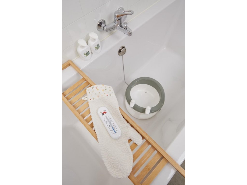 Chcete si užiť pri kúpaní so svojím dieťaťom ešte viac zábavy? Vyskúšajte béžovú froté žinku v tvare veľkej rukavice. Vyrobené z luxusného žakárového froté.
