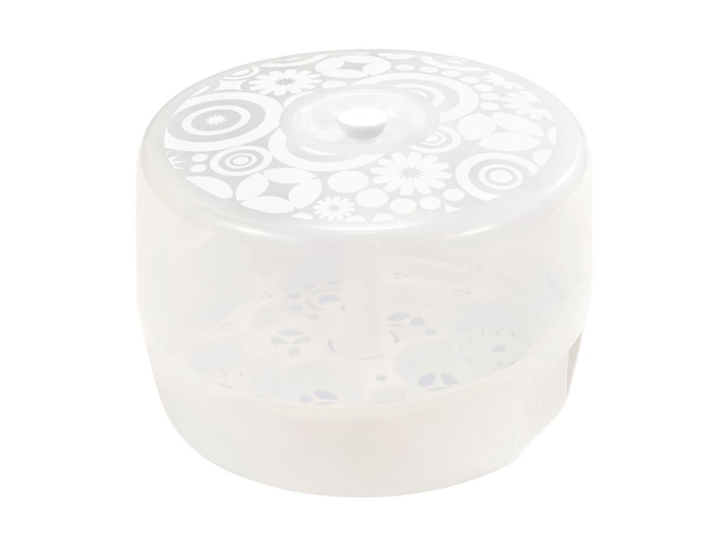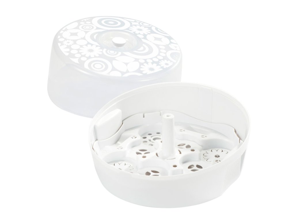 Tip: Vnútorný košík sterilizátoru sa dá použiť aj ako odkvapkávač, aby sa S-fľašky nemuseli sušiť. Sterilizátor je vysoý 17 cm a má priemer 28 cm. Vojde sa tak do väčšiny mikrovlnných rúr.