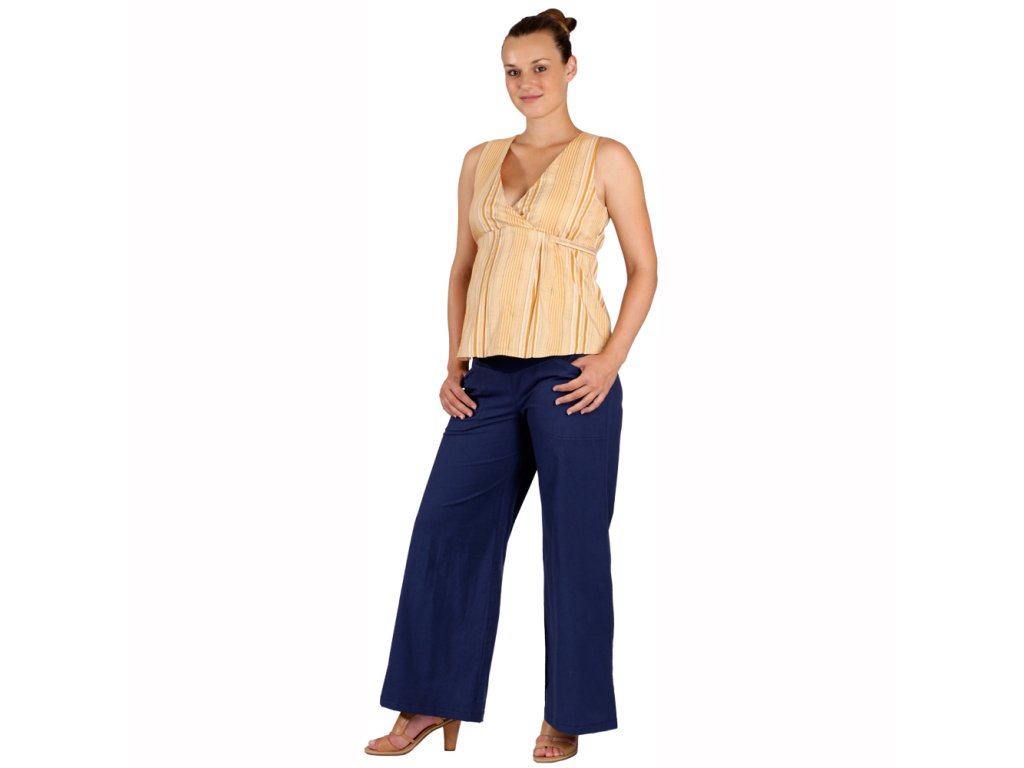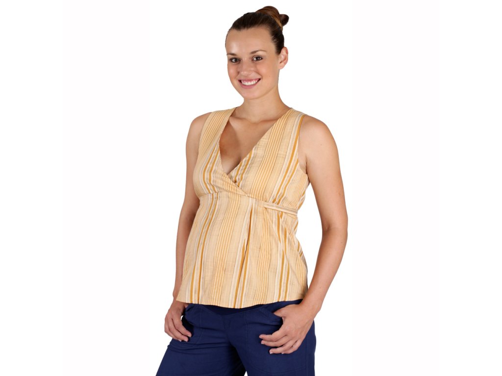 Tehotenská blúzka bez rukávov s výstrihom do V. Predný diel je prestrihnutý pod prsiami a na spodnom diele sú vytvorené záhyby, ktorými vzniká voľnosť pre rastúce bruško. V záhyboch je všitá šnúrka, ktorá sa zaväzuje na zadnom diele a podľa rastúceho bruška sa povoľuje. Výstrih je riešený prekrížením vrchných predných dielov.