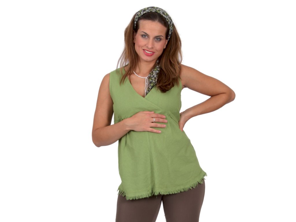 Tehotenská blúzka bez rukávov s výstrihom do V. Predný diel je členený pod prsiami a na spodnom diele sú vytvorené záhyby, ktorými vzniká voľnosť pre rastúce bruško. V záhyboch je všitá šnúrka, ktorá sa zaväzuje na zadnom diele a podľa rastúceho bruška sa povoľuje. Výstrih je riešený prekrížením predných dielov. Dolný okraj blúzky je nezašitý a ozdobne prešitý.